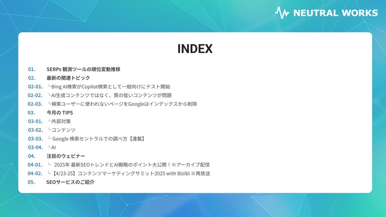 株式会社ニュートラルワークス(本社:神奈川県藤沢市、代表取締役:三木五月、以下「ニュートラルワークス」)は、自社の専門領域である、データ分析を活用した成果に繋げるためのSEO(検索エンジン最適化)に関する最新動向をまとめた「SEOトレンドレポート2025年4月号」を公開いたしました。