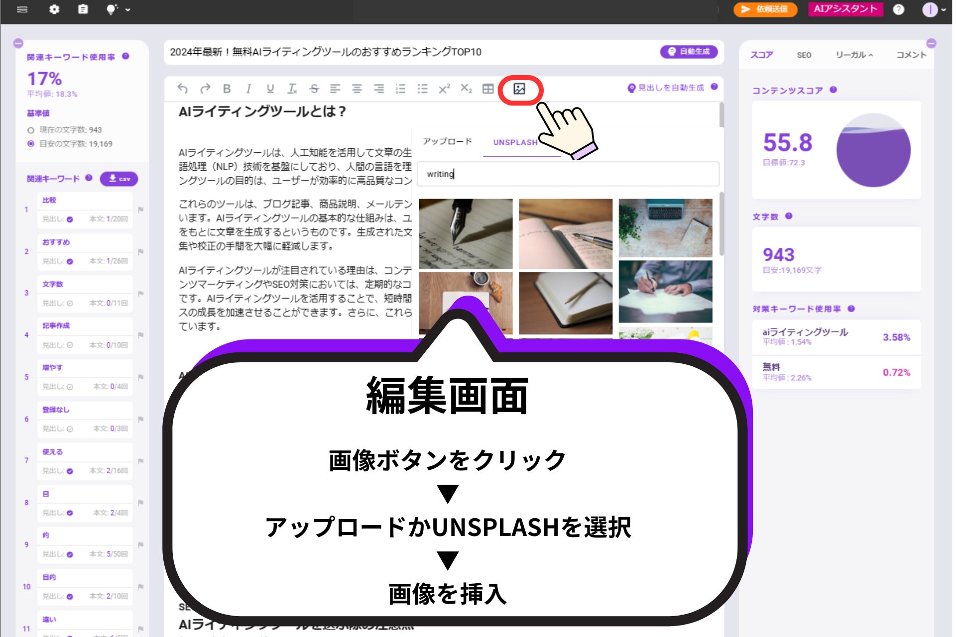 編集画面において、好きな画像をアップロードを挿入したり、商用利用可能の画像を利用したりできます。従来の編集画面に比べて、公開予定のコンテンツのイメージがわきやすくなりました。