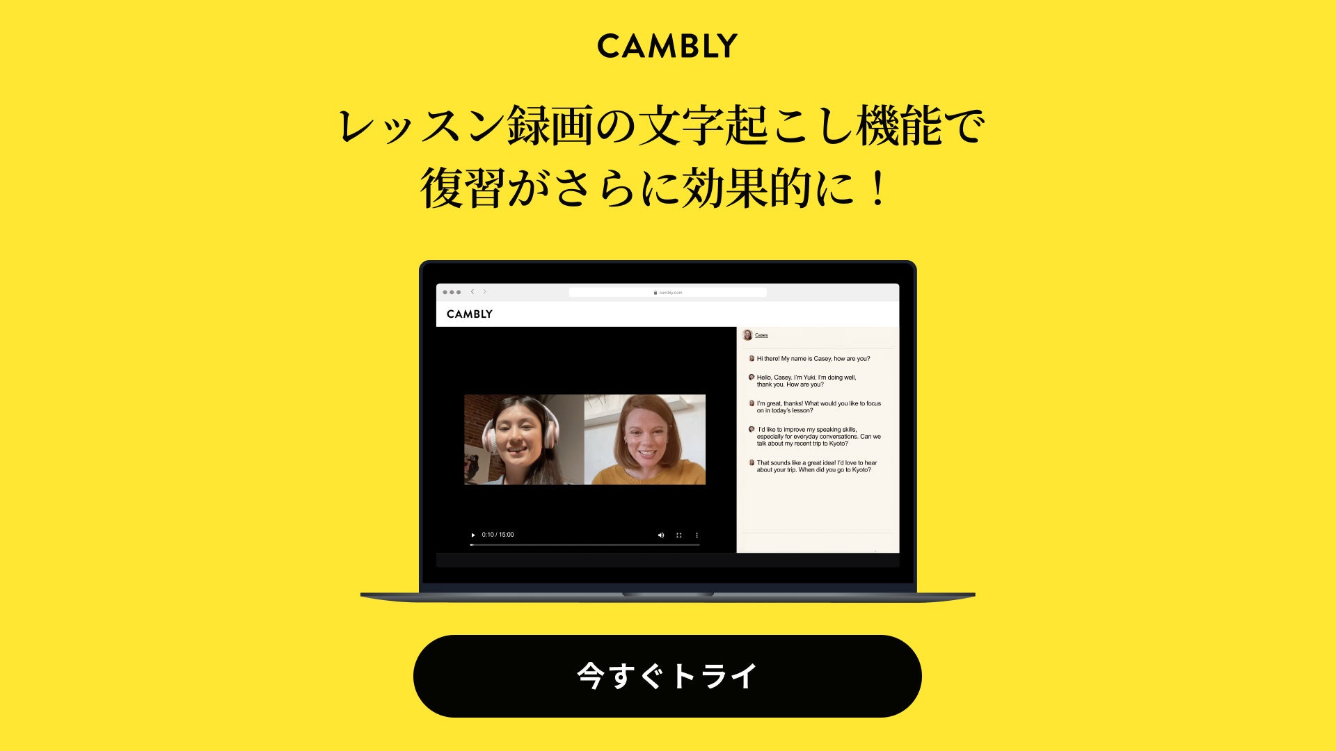 オンライン英会話の中でも、レッスンの録画機能を備えたサービスは多くありません。文字起こし機能も加わり、ますますレッスンの復習が効率的にできるようになったCamblyをこの機会にぜひご体験ください。