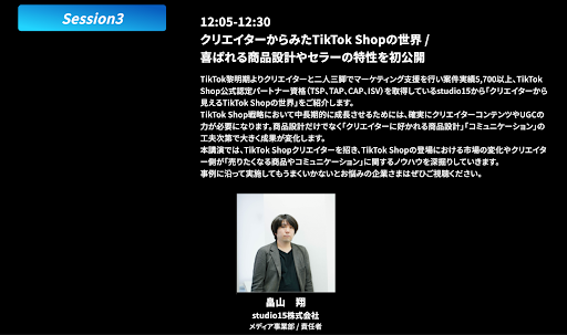 studio15のセッションでは、メディア事業部 / 責任者の畠山と、実際にTikTok Shopで活躍するクリエイターの2名で登壇します。今回で唯一、クリエイター自身も登壇するので、ビジネス/クリエイティブの両側面でTikTok Shop攻略の道筋を解説します。