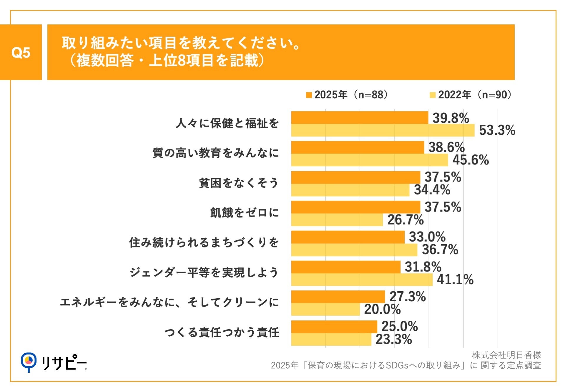 Q4で「とても思う」「思う」と回答した方に、「Q5.取り組みたい項目を教えてください。(複数回答)」(n=88)と質問したところ、「人々に保健と福祉を」が39.8%、「質の高い教育をみんなに」が38.6%という回答となりました。