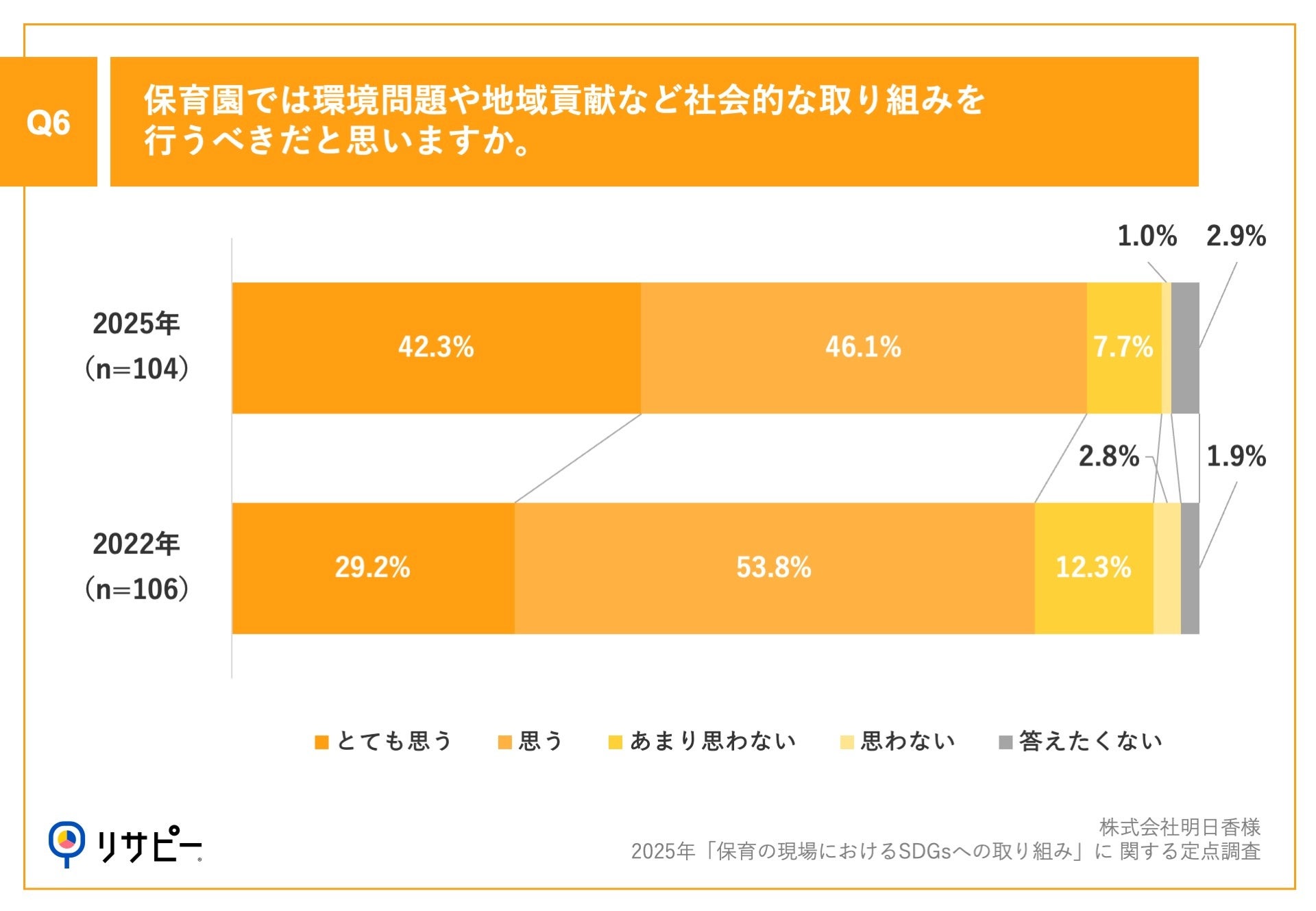 「Q6.保育園では環境問題や地域貢献など社会的な取り組みを行うべきだと思いますか。」(n=104)と質問したところ、「とても思う」が42.3%、「思う」が46.1%という回答となりました。