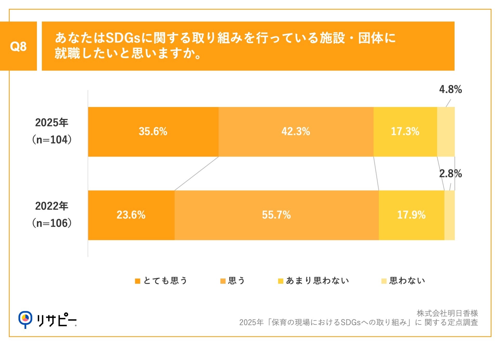 「Q8.あなたはSDGsに関する取り組みを行っている施設・団体に就職したいと思いますか。」(n=104)と質問したところ、「とても思う」が35.6%、「思う」が42.3%という回答となりました。