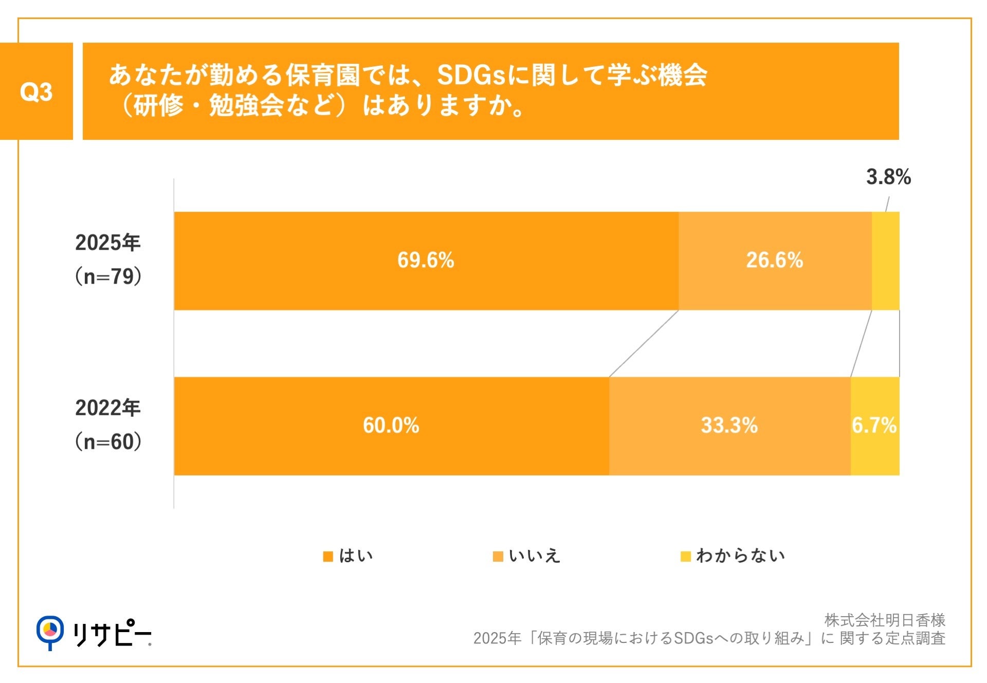 Q1で「はい」と回答した方に、「Q3.あなたが勤める保育園では、SDGsに関して学ぶ機会(研修・勉強会など)はありますか。」(n=79)と質問したところ、「はい」が69.6%、「いいえ」が26.6%という回答となりました。