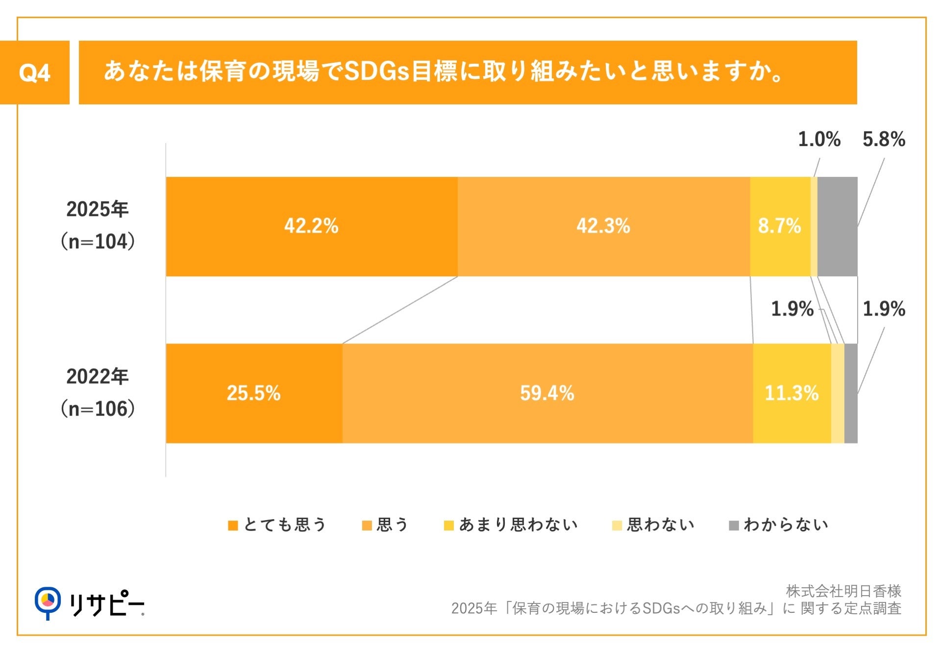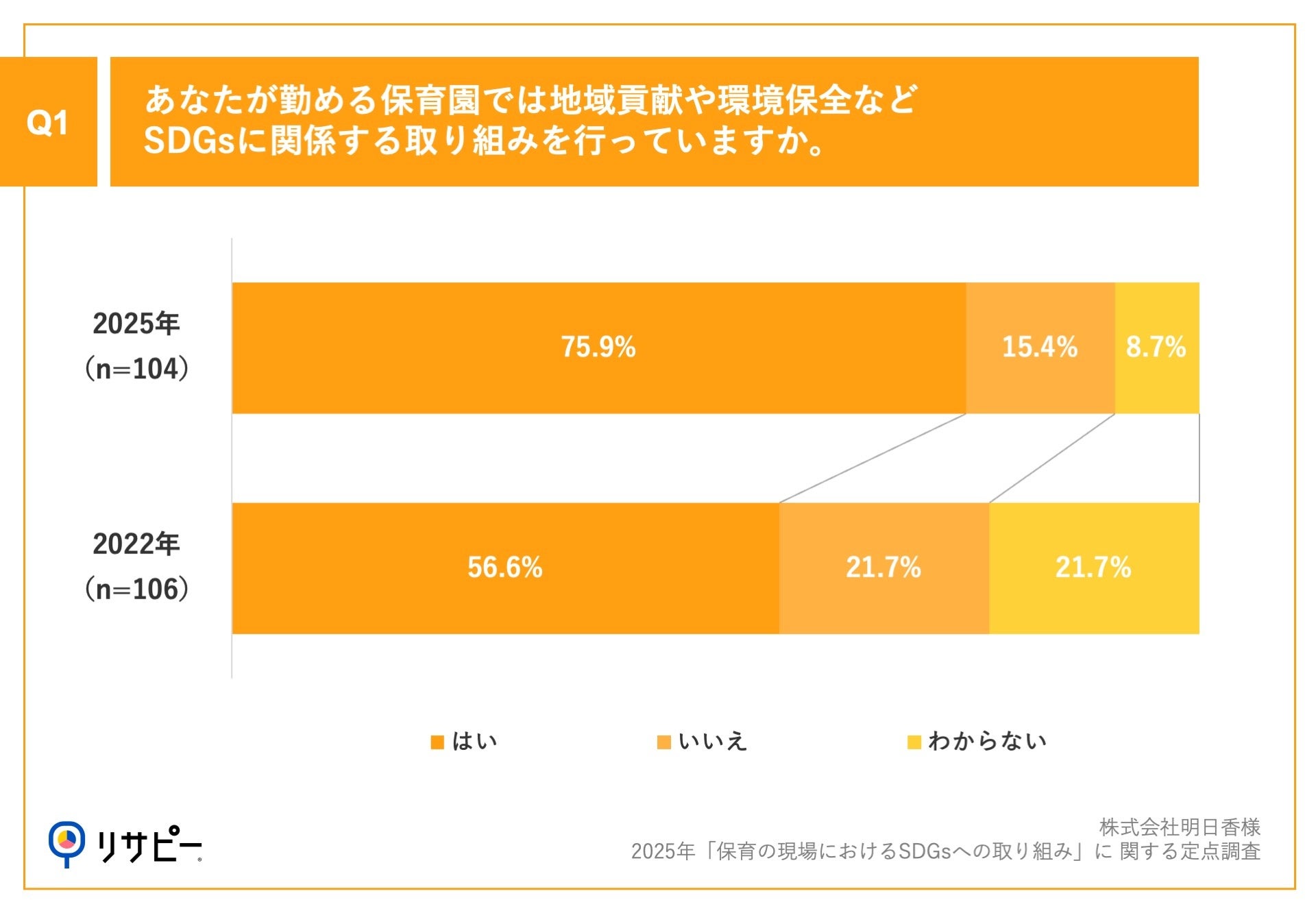 株式会社明日香(本社:東京都文京区、代表取締役:萩野 吉俗、https://www.g-asuka.co.jp/index.htm)が運営する子どもと未来、そしてすべての人がConnect(繋がり、結びつき)する保育研究プロジェクト「子ねくとラボ(https://konnect-labo.jp/)」は、SDGsを知っている現役保育士104名を対象に、2025年「保育の現場におけるSDGsへの取り組み」に関する定点調査を実施しましたので、お知らせいたします。