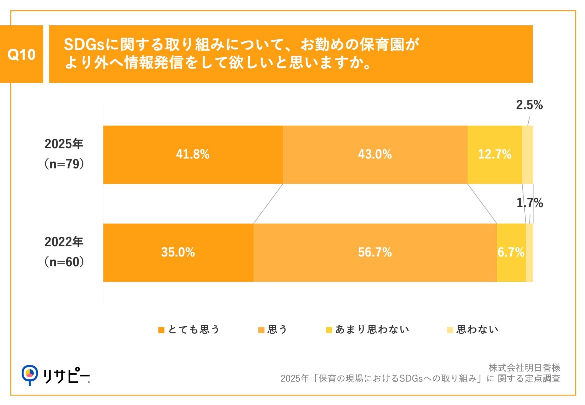 Q1で「はい」と回答した方に、「Q10.SDGsに関する取り組みについて、お勤めの保育園がより外へ情報発信をして欲しいと思いますか。」(n=79)と質問したところ、「とても思う」が41.8%、「思う」が43.0%という回答となりました。