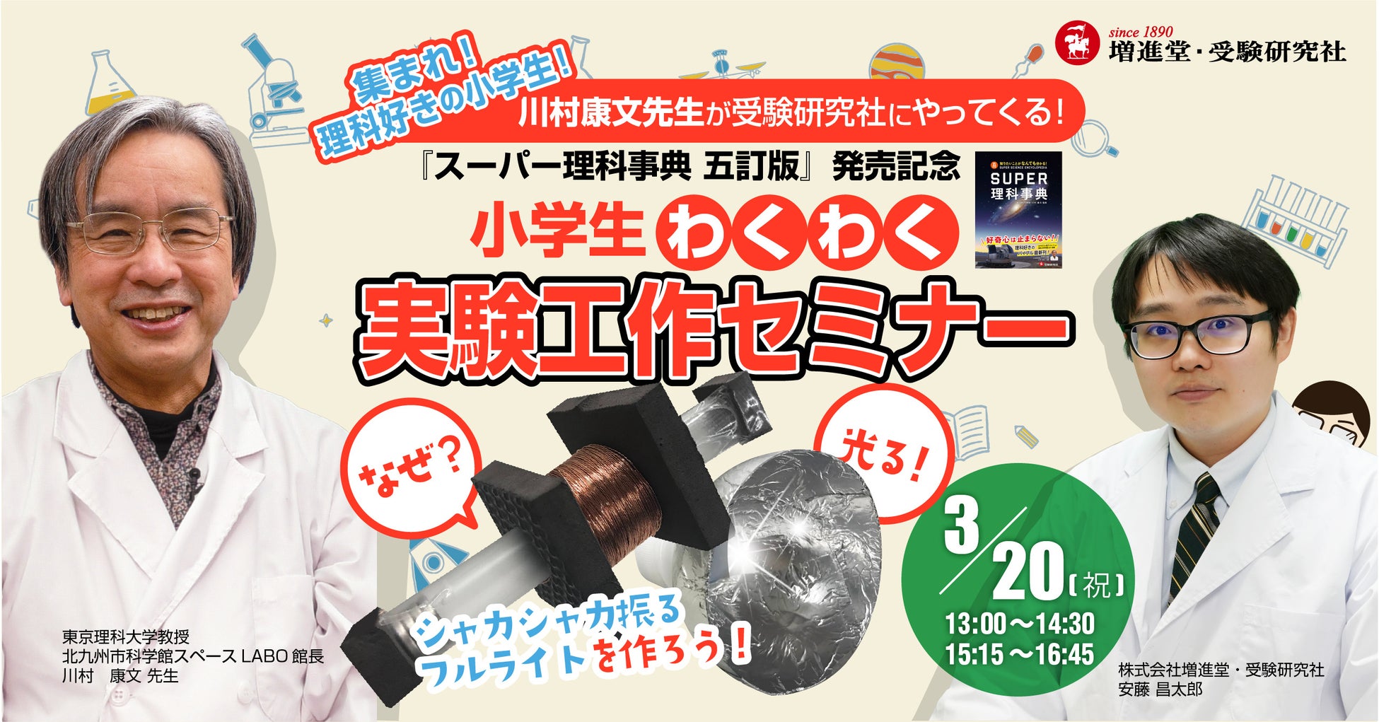 株式会社増進堂・受験研究社(本社:大阪市西区、代表取締役:岡本泰治)は、2024年3月20日(水)春分の日に、「チコちゃんに叱られる!」(NHK)にも出演している川村康文 東京理科大学教授・北九州市科学館スペースLABO館長をゲストに迎え、小学生を対象にした「小学生わくわく実験工作セミナー」を増進堂・受験研究社の大阪本社にて開催いたします。