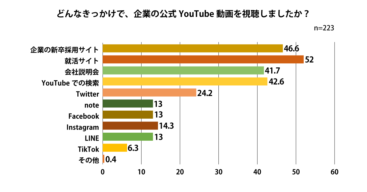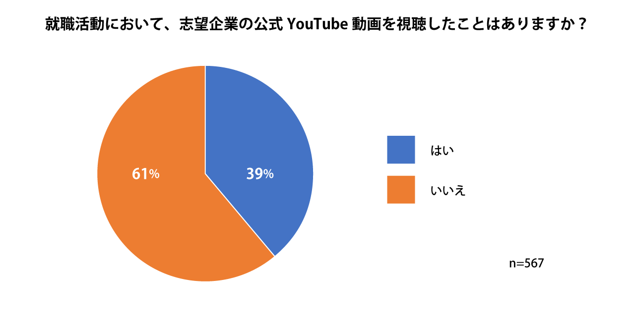 ・全体の約4割が志望企業の公式YouTube動画を視聴したことがあり、きっかけは就活サイトや会社説明会だけでなく、自ら検索して視聴した人も42.6%いる