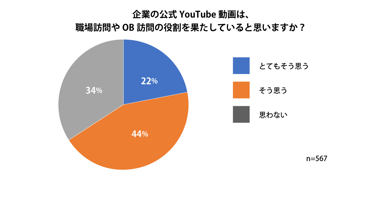 ・「YouTube動画が職場訪問やOB訪問の役割を果たしているか」に対して「とてもそう思う」「そう思う」が66%