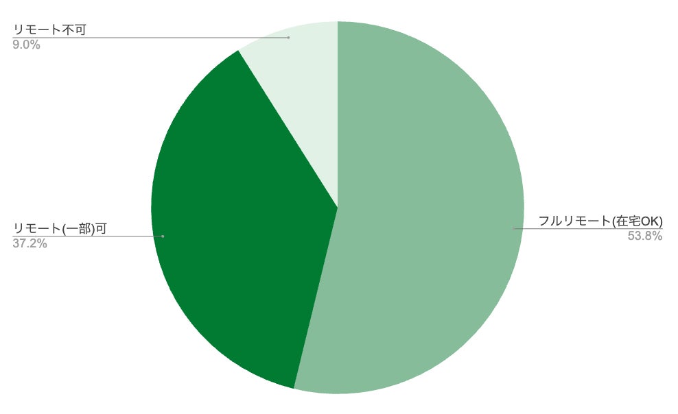 全体の約6割(59.1%)がフルリモートでの勤務が可能で、場所にとらわれない柔軟な働き方が主流となっています。残りの約4割(40.9%)も一部リモートワークが可能となっており、完全出社を求める案件は皆無という状況です。このことから、Tableau関連の業務がリモートワークと親和性が高く、より柔軟な働き方を実現できる職種であることが示されています。
