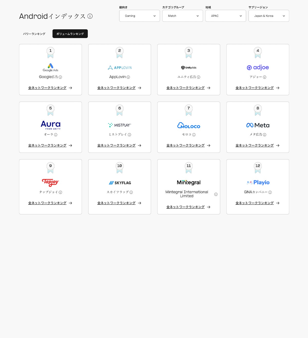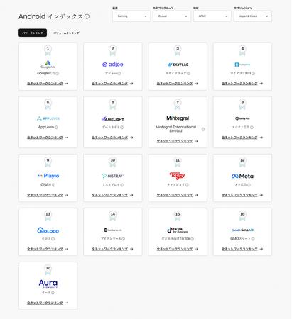 広告効果の質を測るパワーランキングと量を測るボリュームランキングにおいて、iOS・Androidともに各部門にランクインしています。特にゲームカテゴリーでは、iOSのパワーランキングにて「Midcore」部門で2位、「Casual」部門で6位、「All Categories」部門で7位、ボリュームランキングにて「Midcore」部門で4位、「Casual」部門で11位、「All Categories」部門で7位を獲得。Androidのパワーランキングにて「Midcore」部門で3位、「Casual」部門で3位、「Strategy」部門で3位、「Match」で4位、「RPG」部門で5位、ボリュームランキングにて「Midcore」部門で6位、「Casual」部門で12位、「Strategy」部門で5位、「Match」で10位、「RPG」部門で6位という結果となりました。