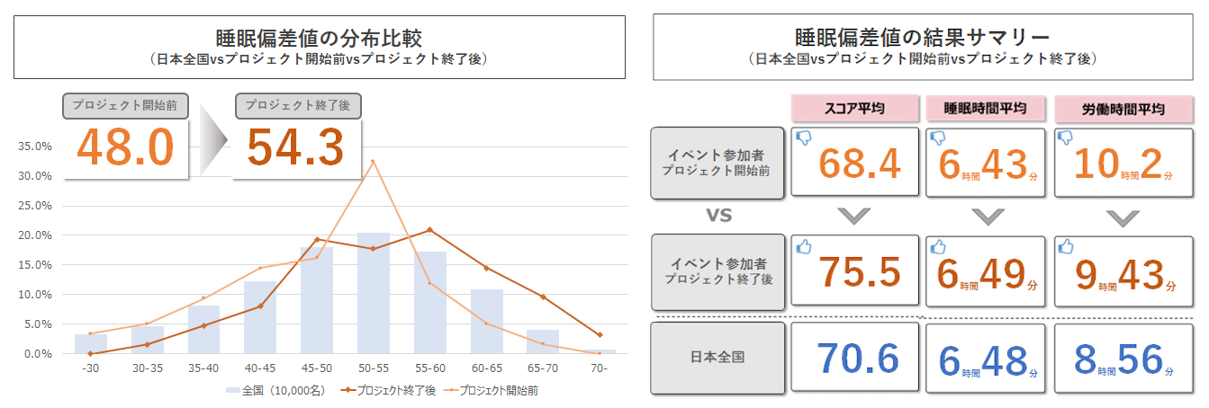睡眠偏差値はプロジェクト開始前の48.0と比べて、+6.3ポイントとなる54.3と大幅に改善しました。また睡眠時間においても、+6分改善されました。睡眠負債においては25分の改善が見られました。これは睡眠改善の知識を学び、コンテンツなどを活かして睡眠習慣を見直し、正しく習慣化することで、睡眠の質が改善された結果であると考えられます。