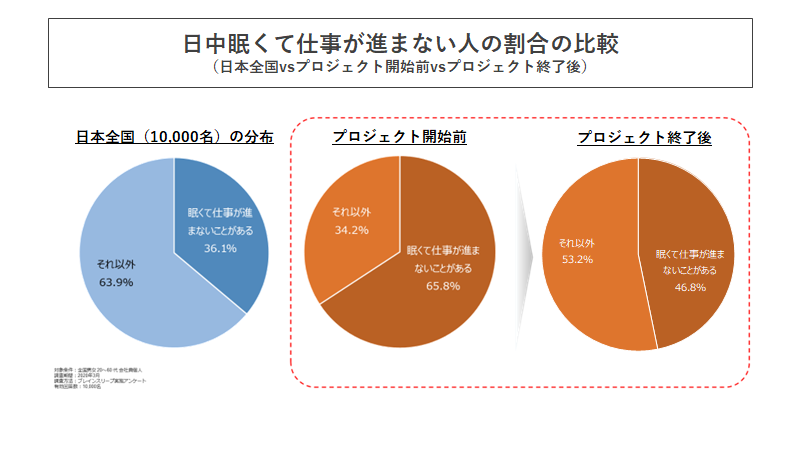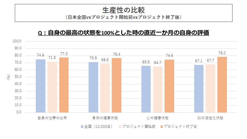 オフィスワーカーにとって重要な指標の一つである生産性に関する数値の向上も見られました。身体と心の健康状 態や脳の活性状態においてはそれぞれ+10.5ポイントが確認できました。また生産性において重要な指標である日中の眠気に関しては「日中眠くて仕事が進まないことがある」との回答が-22.9ポイントという結果でした。