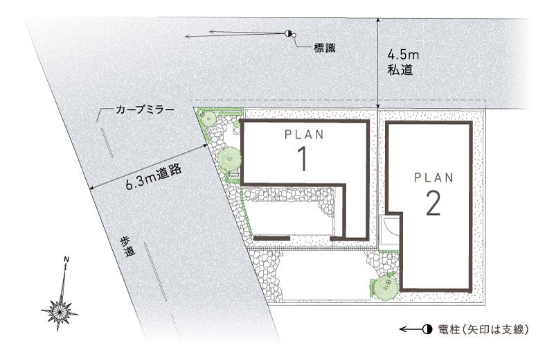 6.3mと4.5mの2面が道路となる、伸びやかな角地ポジションで、6.3m公道には歩道も備わります。