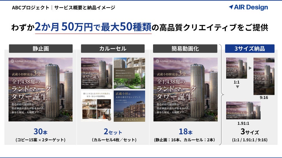 本プランの提供により、物件のURLをご共有いただくだけで、AIと専門チームが最短2ヶ月で最大50種類の広告クリエイティブを制作し、販売初期のリード獲得の最大化に貢献します。