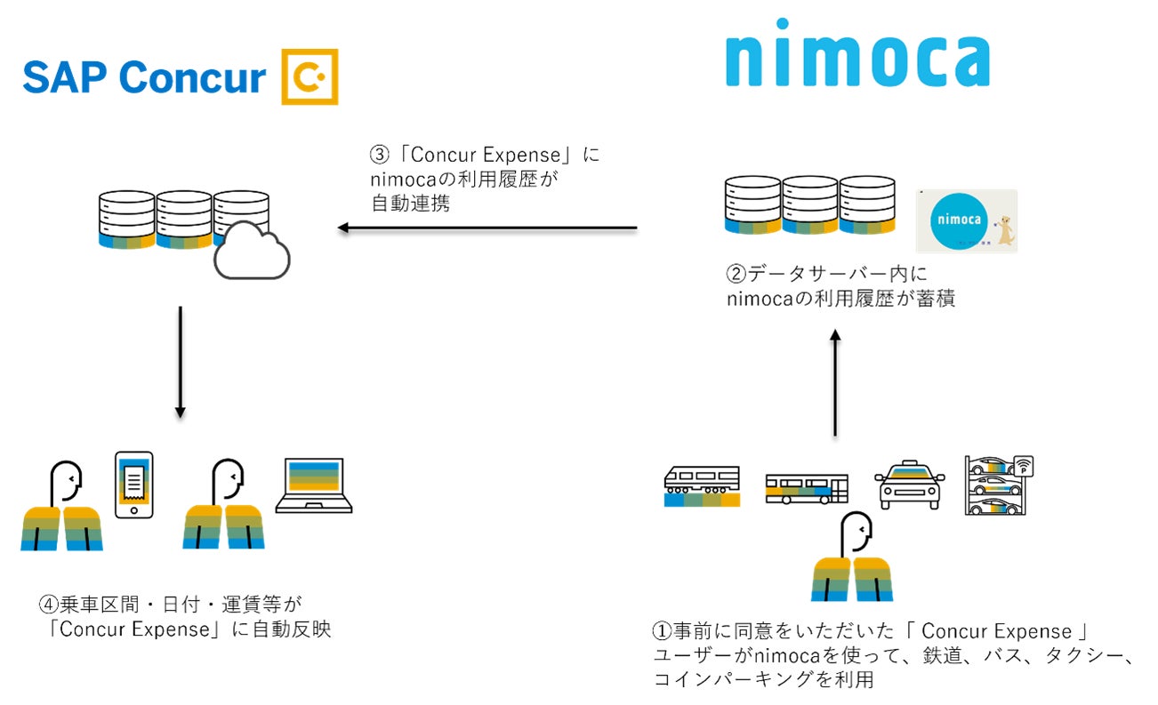 鉄道、西鉄バスをnimocaで利用すると、最短で乗車翌日に利用履歴データがConcur Expenseに自動で連携されます。九州圏での移動手段の要となる西鉄バスの乗降履歴データとの連携は、乗降した停留所名まで反映されます。また、タクシーやコインパーキングなどを利用した際の利用履歴データもConcur Expenseに連携されます。これらの機能により、Concur Expenseを利用する企業が旅費精算を行う際、入力業務の削減、申請漏れが防止されるほか、データの改ざんは不可能であるため、承認者・経理部門のチェックの負担が大幅に軽減します。