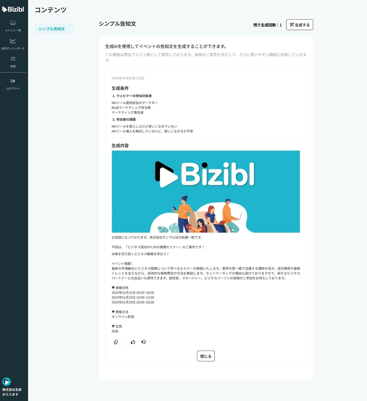 株式会社Bizibl Technologies(よみ:ビジブルテクノロジーズ、本社:東京都千代田区、代表取締役:花谷燿平、以下当社)は、開発・提供するウェビナーマーケティングSaaS「Bizibl(ビジブル)」において、「告知メール生成機能」を公開いたしました。