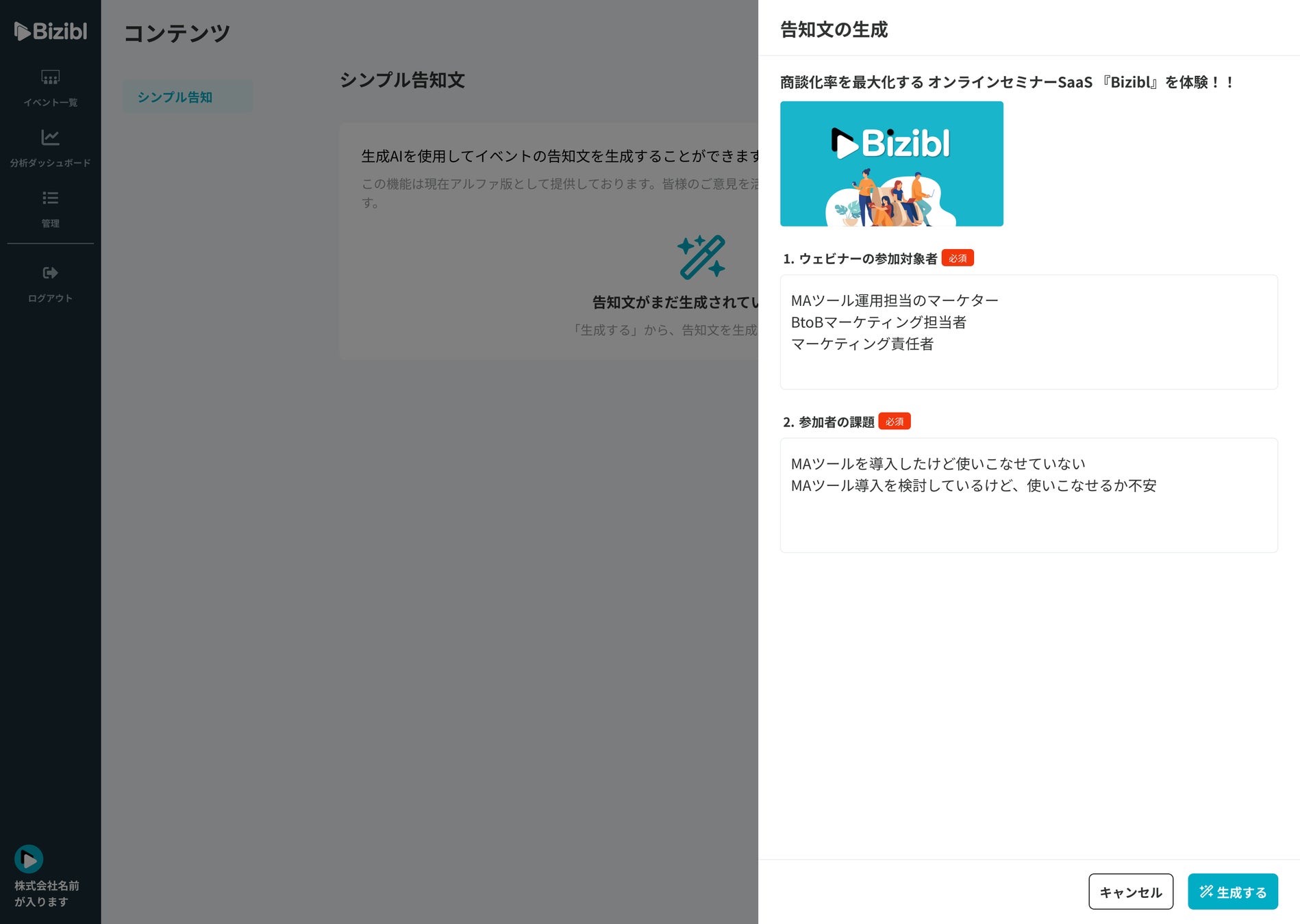 「コンテンツ作成」ページで「ウェビナーの参加対象者」「参加者の課題」を入力することで、本文が自動で生成されます