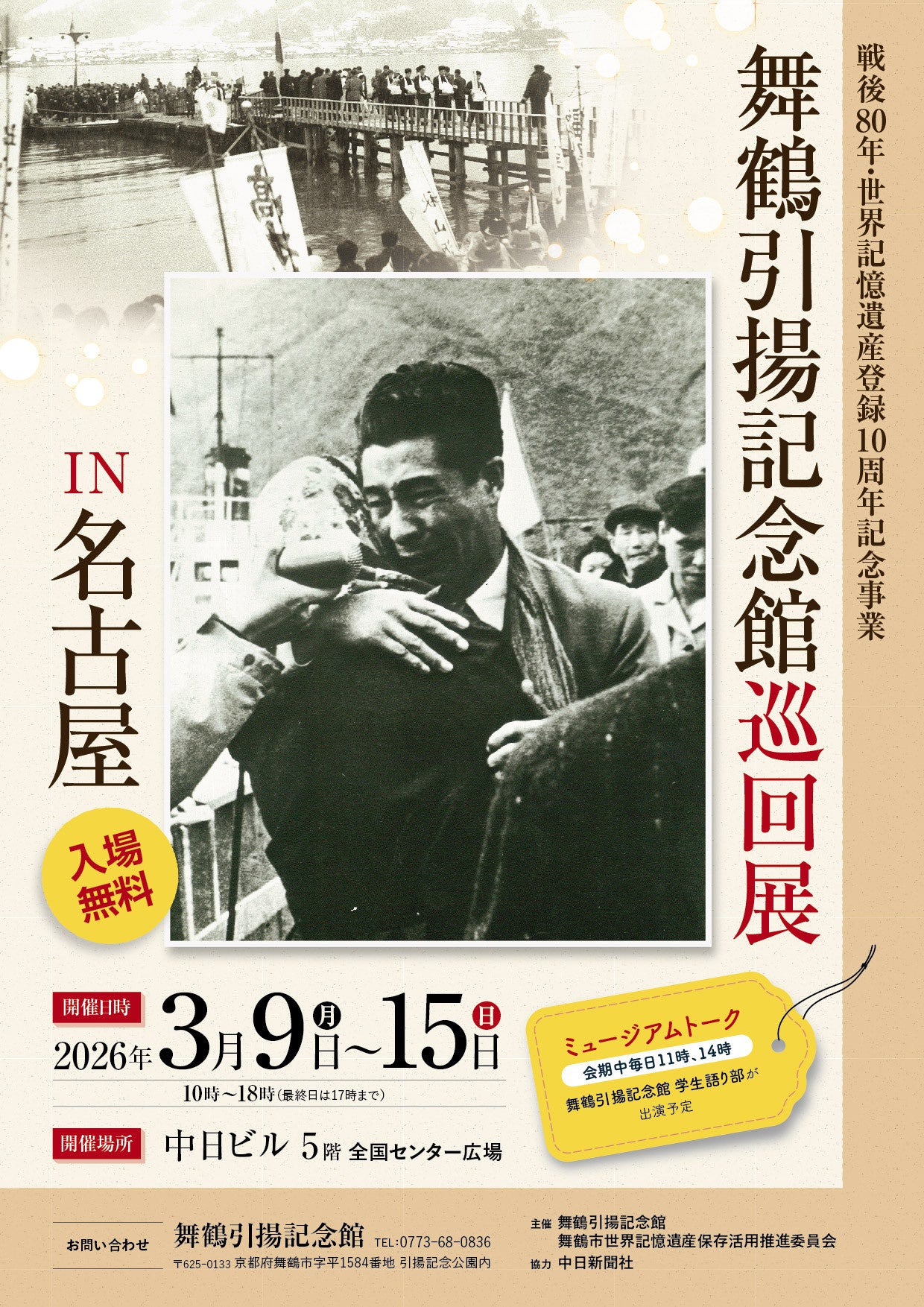 舞鶴市は、令和7年度に展開してきた戦後80年・ユネスコ世界記憶遺産登録10周年の記念事業として、かつて舞鶴と同じく引揚港として約26万人の引揚者を迎え入れた名古屋市において「舞鶴引揚記念館巡回展 IN 名古屋」を開催いたします。