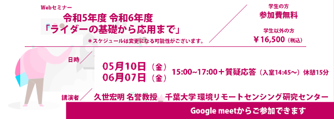 本セミナーは光業界に関わるあらゆる方(研究者・候補者(学生)の方、企業 研究開発部門の方等)を対象に、リモートセンシング業界に精通されている、久世 宏明 名誉教授 千葉大学 環境リモートセンシング研究センターを新講師としてお招きし、「ライダーの基礎から応用まで」の解説をいただきます。本セミナーは全5回を予定しております。