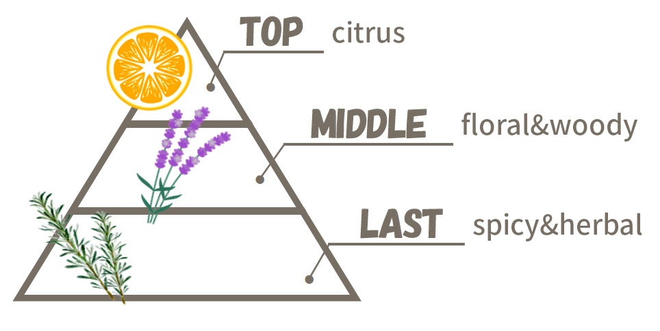 初めにレモン/オレンジ/グレープフルーツ/ベルガモットの柑橘系の香りが広がります。その後、ニオイテンジクアオイ/ラベンダー/パルマローザが、フローラルな香りを加え、落ち着きを与えます。さらに、クスノキ/ジュニペルスメキシカナ/シベリアモミが、森林の香りを演出し、香りに深みを与えます。最後にビターオレンジ/ユーカリ/レモングラス/ローズマリー/フランキンセンスが、スパイシーでハーバルな香りを加え、アクセントとなっています。全体的に、フレッシュでクリーンな印象を与える香りです。
