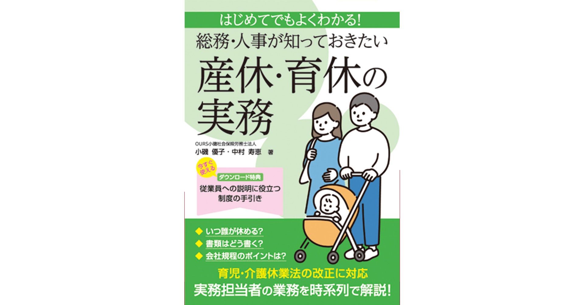 育児・介護休業法の改正にも対応し、「いつ・誰が休めるのか」「書類はどう書くのか」「会社規程のポイントはどこなのか」といった内容を、妊娠・出産・育児の時系列にそって解説します。