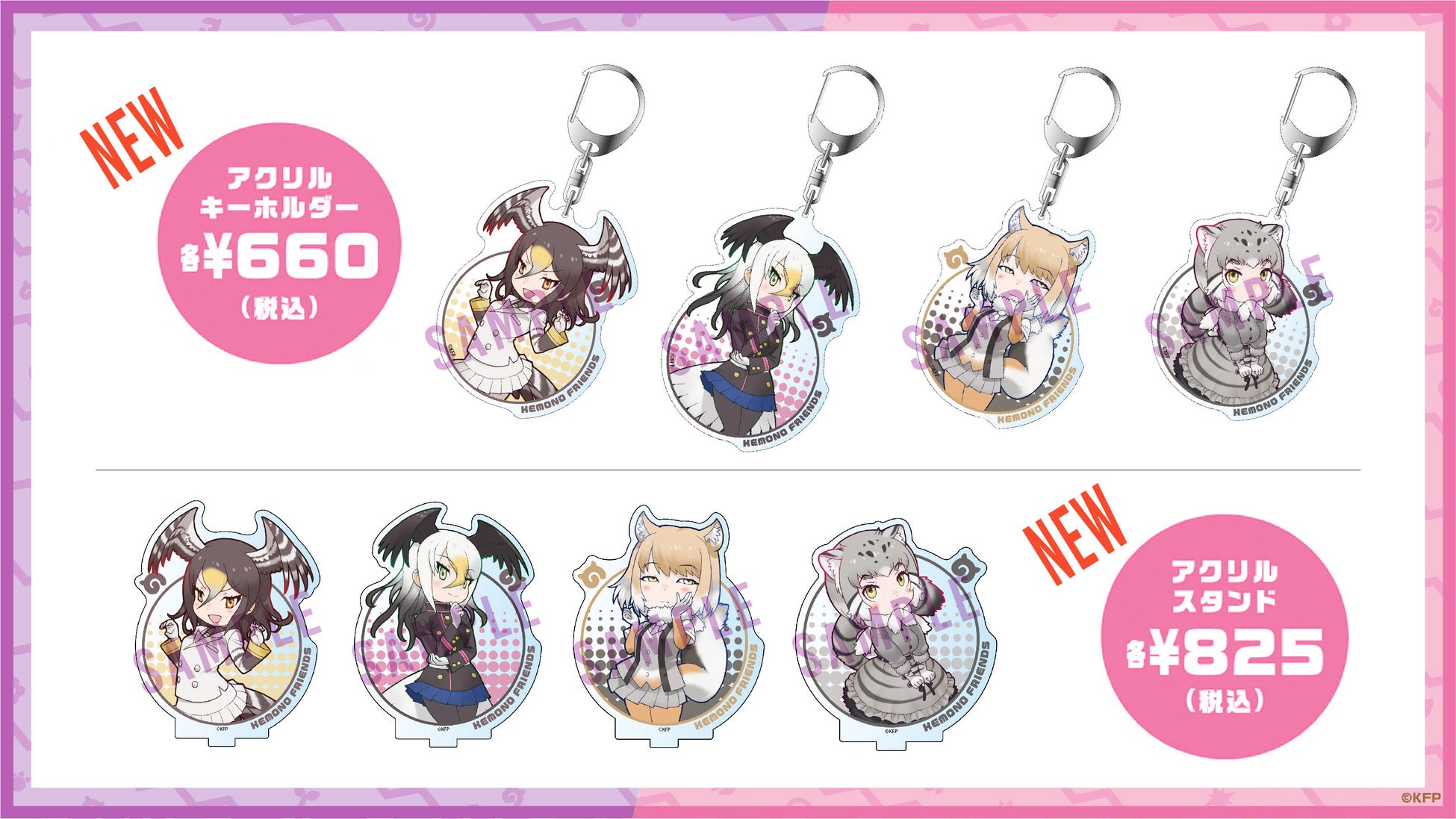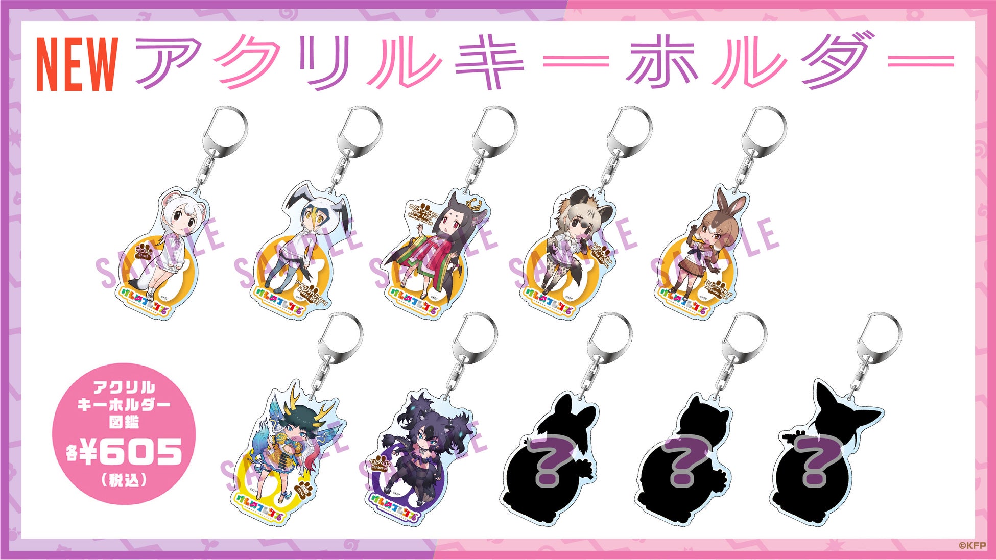 「けものフレンズ」では恒例の「アクリルキーホルダー図鑑」10種、ゲームアプリ用に描き下ろしたビジュアルからなるシリーズの「アクリルキーホルダー」「アクリルスタンド」は、各4種が追加。またSHOP内では、「けものフレンズ3」初のコンセプトアート展示を同時開催する。