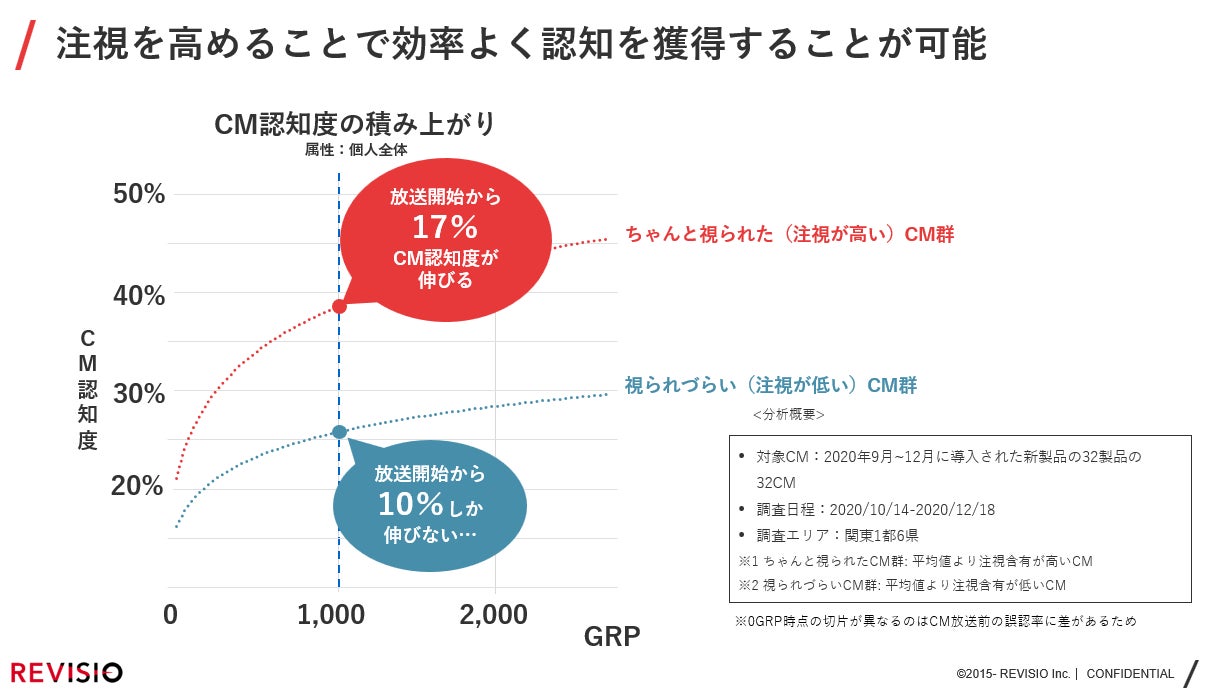 REVISIOの調査ではアテンション(注視)を高めることで認知度の獲得に差が生じることがわかっています。