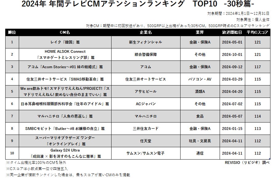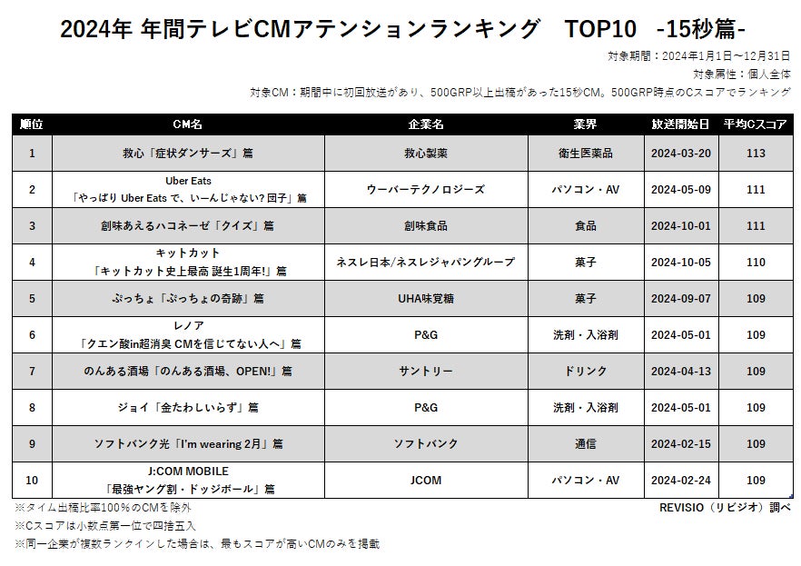 関東にて2024年1月~2024年12月に初回放送があり、かつ500GRP以上出稿の15秒/30秒CMを対象に、500GRP時点のCスコアでランキング