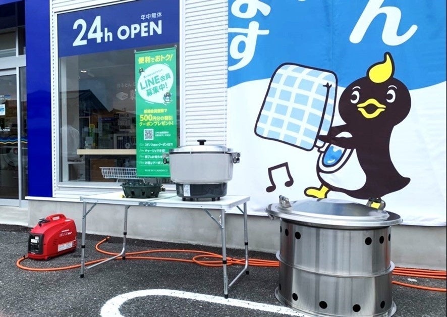 災害対応型ランドリーは「標準仕様」として3日分のLPガスを貯槽できるLPガスボンベ、ポータブル発電機への接続が可能な設備を完備します。ポータブル発電機はガスを利用して発電する仕組みになっており、携帯電話充電などへ電力供給することができます。また、店舗にガスコンロ、ガス炊飯器を導入し、被災者向けの炊き出しが可能になります。昨今の社会情勢により三密回避に向けた分散避難が必要となる中、コインランドリーを“一時避難所“として活用する事ができます。なお、今回のオープン店舗を含む200店舗中83店舗(※2022年10月28日現在)が災害対応型コインランドリーとして機能しています。