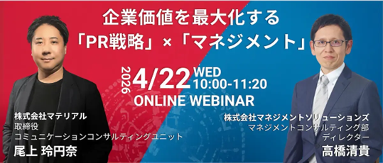 株式会社マネジメントソリューションズ(本社:東京都港区、代表取締役会長兼社長:高橋 信也、以下 MSOL)は、株式会社マテリアル(本社:東京都港区、代表取締役社長 青﨑 曹)と共催で、企業の経営層の方、担当者様を対象としたWebセミナー『企業価値を最大化する「PR戦略」×「マネジメント」』を開催いたします。「攻め」のPRを担う株式会社マテリアルの尾上玲円奈氏と、「守り」のPMOを担うMSOLの高橋清貴が登壇し、グローバルにおける経営の定石となっている「PRドリブン経営」に基づき、戦略策定時から実行と発信を同期させ、企業価値を最大化へと導くアプローチについて対談形式で深掘りいたします。