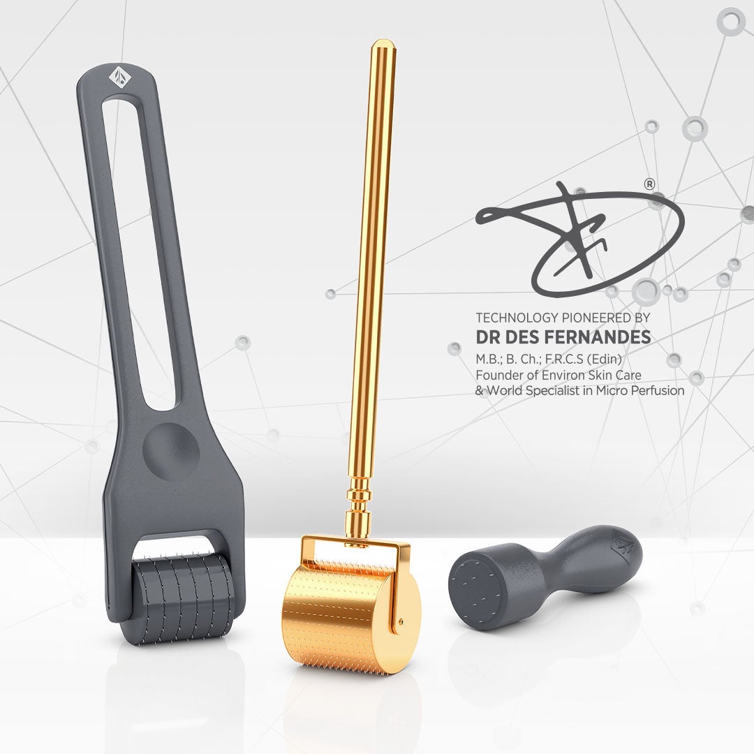 エンビロンの14金メッキのゴールドコスメティックロールキットは、プロフェッショナルからスキンケア愛好家まで、幅広く信頼されているスキンケアツールです。この補完的なスキンケア技術は、肌が最も必要とする場所に美容成分を届ける*³ことで、よりよい結果へと導きます。