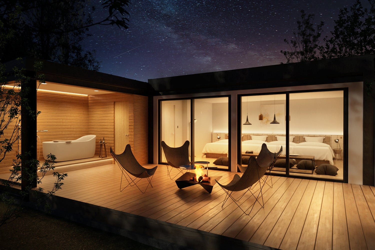 八ヶ岳の豊かな大自然に抱かれる上質な非日常のひとときを気兼ねなく楽しんでいただくため「八ヶ岳PRIVATE WOODS NADA」の客室は全て1棟貸切タイプ。広い敷地にわずか3棟のみの贅沢な配置。