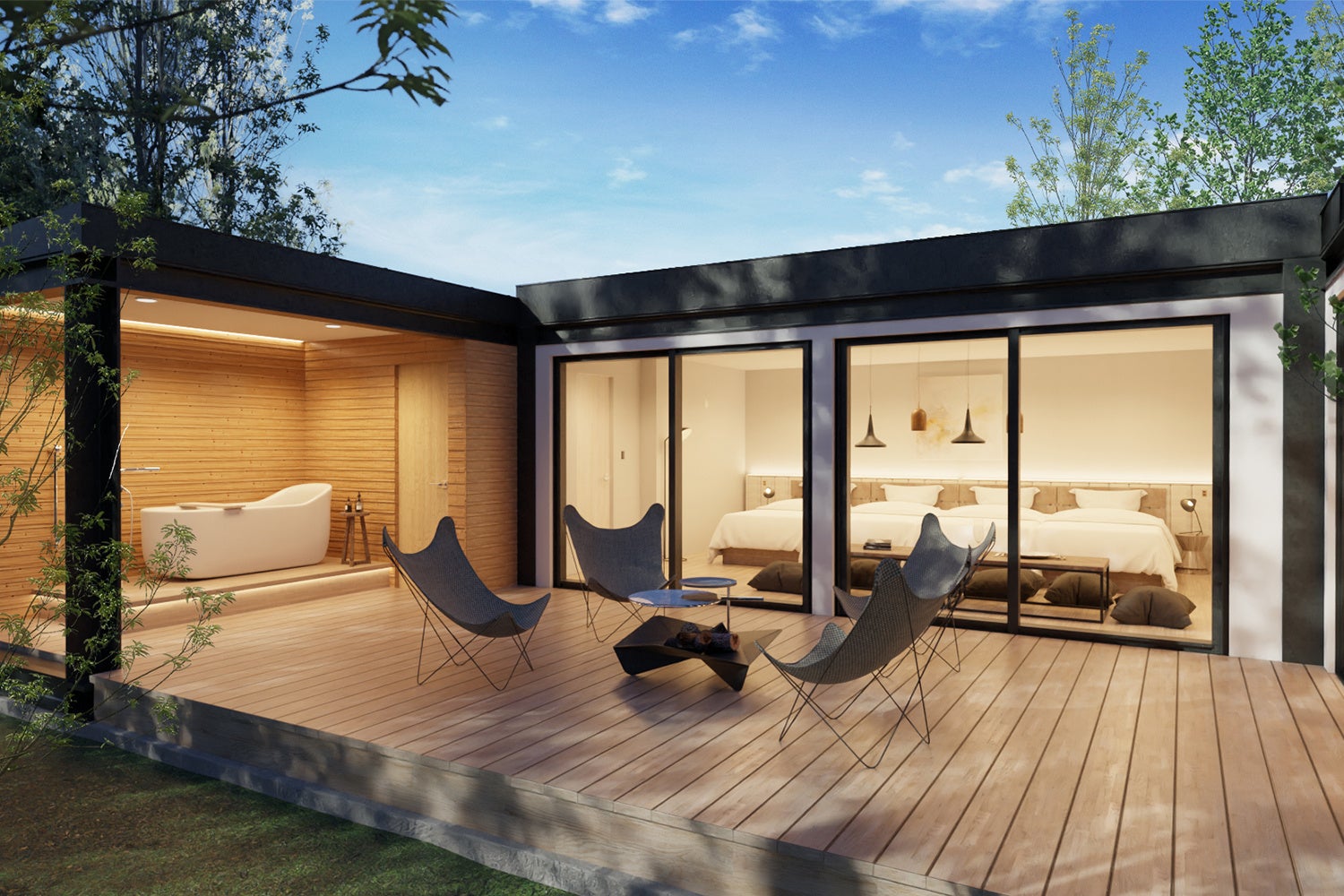 「八ヶ岳PRIVATE WOODS NADA」の各客室棟には専用のアウトドアリビングスペースを完備しております。