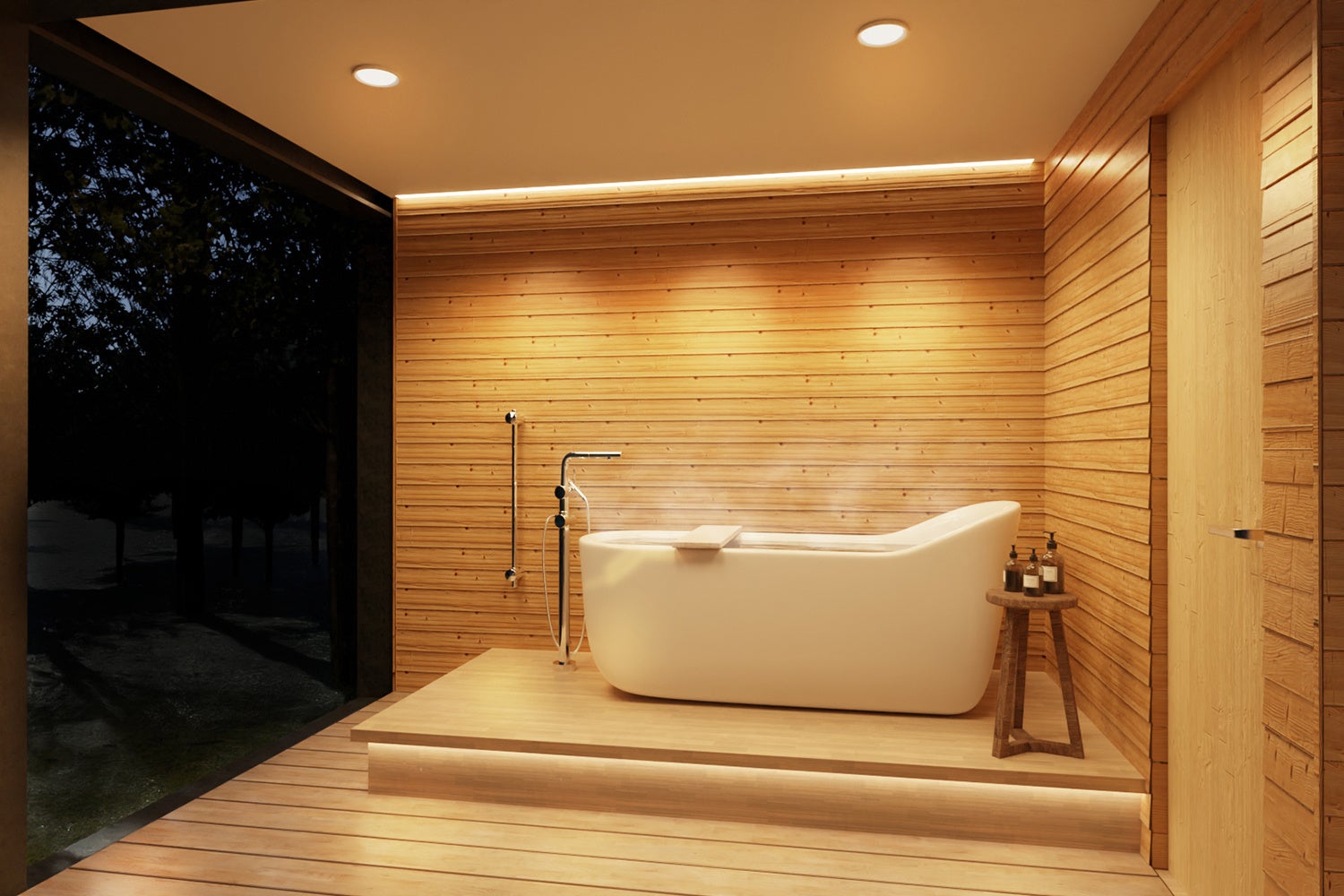 客室には長野県茅野市のグランピング施設として初の仕様となる各棟専用の半露天風呂を完備しました。慌ただしい日常から少し遠くへ誘う特別なひとときをお過ごしいただけます。