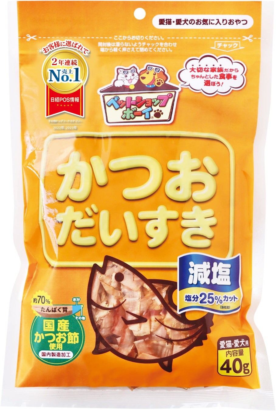 「減塩かつおだいすき40g」は、ペット用おやつとして販売しているマルトモ「だいすきシリーズ」の一つで、大切な家族の一員であるねこちゃん・わんちゃんに安心・安全な食事を提供したいという想いで作られた商品です。近年、ねこちゃん・わんちゃん達も平均寿命が延び健康寿命が課題といわれている中、マルトモはねこちゃん・わんちゃん達の食生活改善のためにいち早く減塩商品提案に取り組んでおり、本商品は当社一般品に比べ塩分を約25%カットした、健康に配慮した商品です。