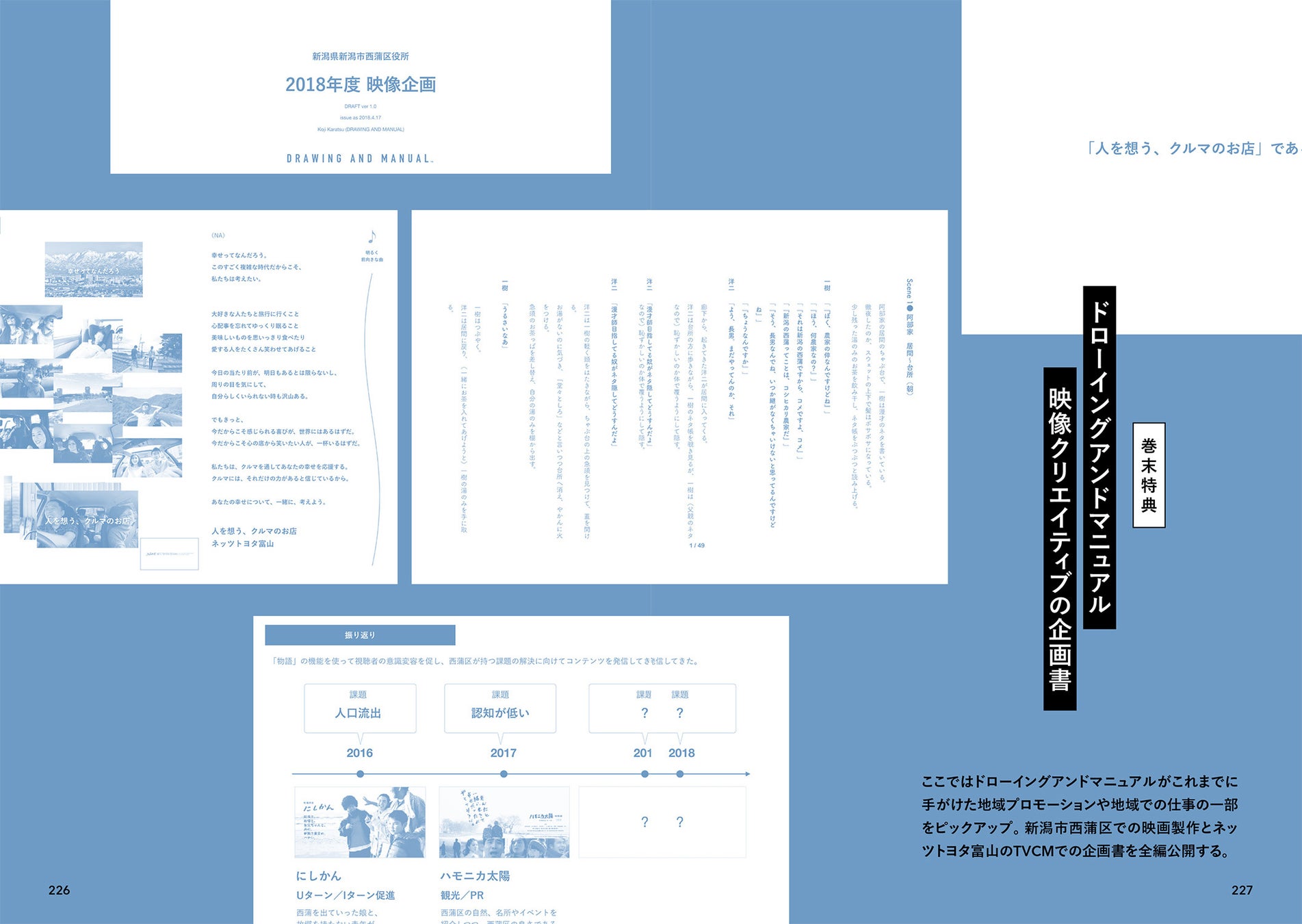 ここではドローイングアンドマニュアルがこれまでに手がけた地域プロモーションや地域での仕事の一部をピックアップ。新潟市西蒲区での映画製作とネッツトヨタ富山のTVCMでの企画書を全編公開する。