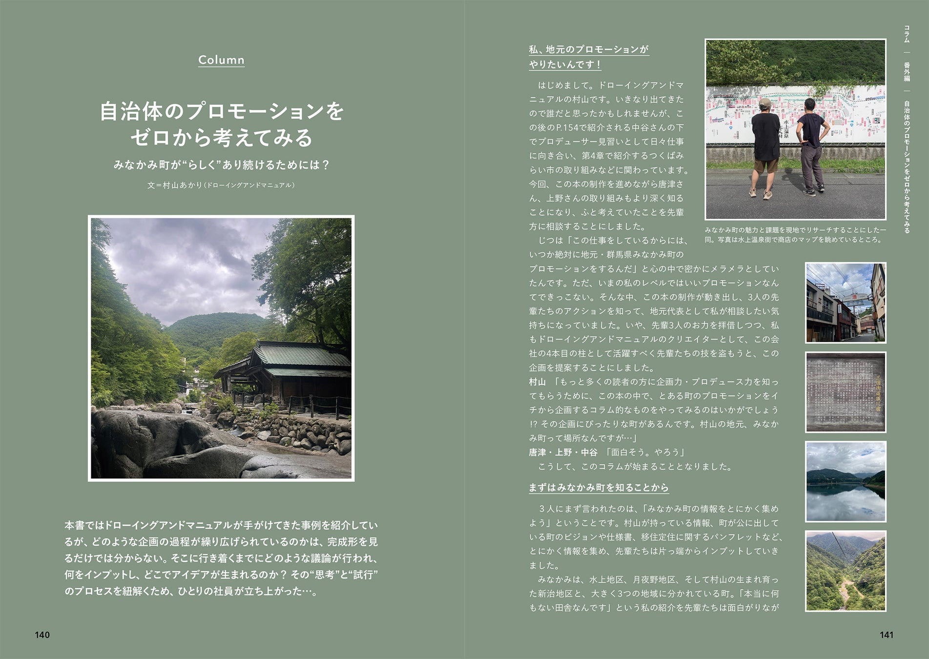 DRAWING AND MANUALのとある社員の地元である群馬県みなかみ町に実際に足を運び、地元の人々への聞き込み調査のもと、頼まれてもいないプロモーション企画をゼロから考えてみる。企画書や気になる見積も掲載。