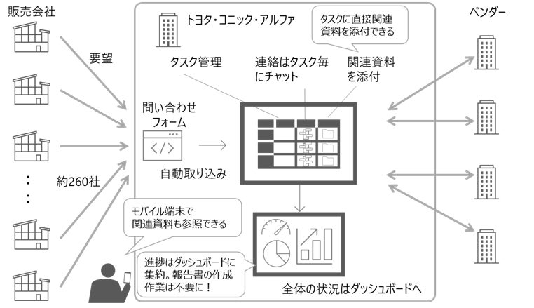 トヨタ・コニック・アルファでは、約260社の販売会社の要望を取り込みながら、アジャイル開発を進めており、ベンダーごとの懸案事項やタスクを複数のExcelファイルで管理していました。
