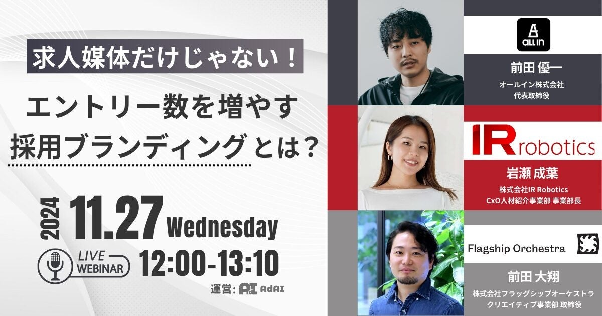 株式会社IR Robotics(本社:東京都千代田区、代表取締役:金 成柱)は、株式会社AdAIが主催する「求人媒体だけじゃない! エントリー数を増やす採用ブランディングとは?」に当社CxO人材事業部長の岩瀬成葉が登壇することをお知らせいたします。