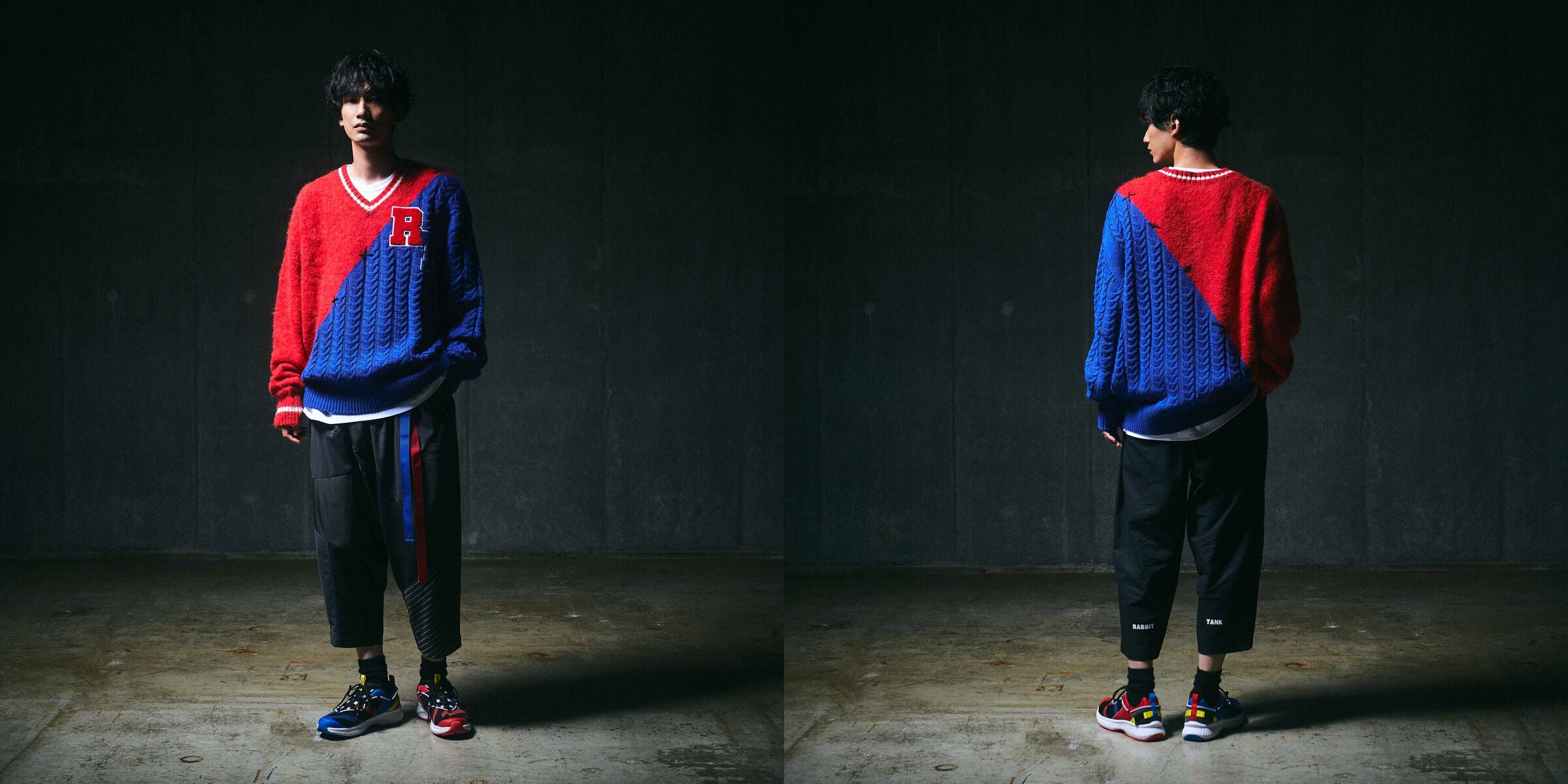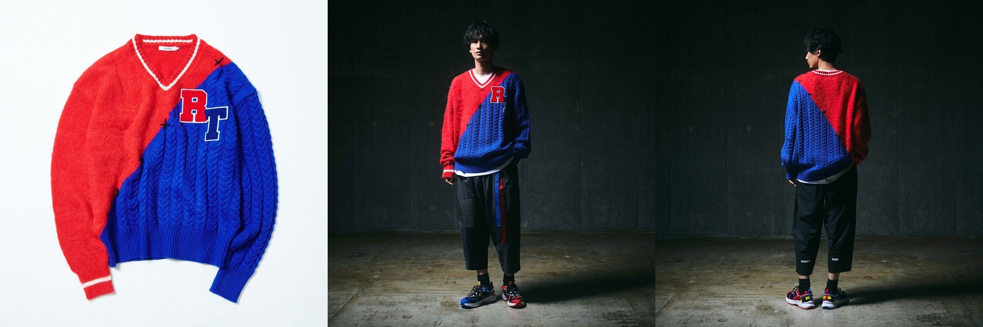 仮面ライダービルドをモチーフに「ラビット」と「タンク」の異なる要素を持つニットを1枚につなぎ合わせたニットです。