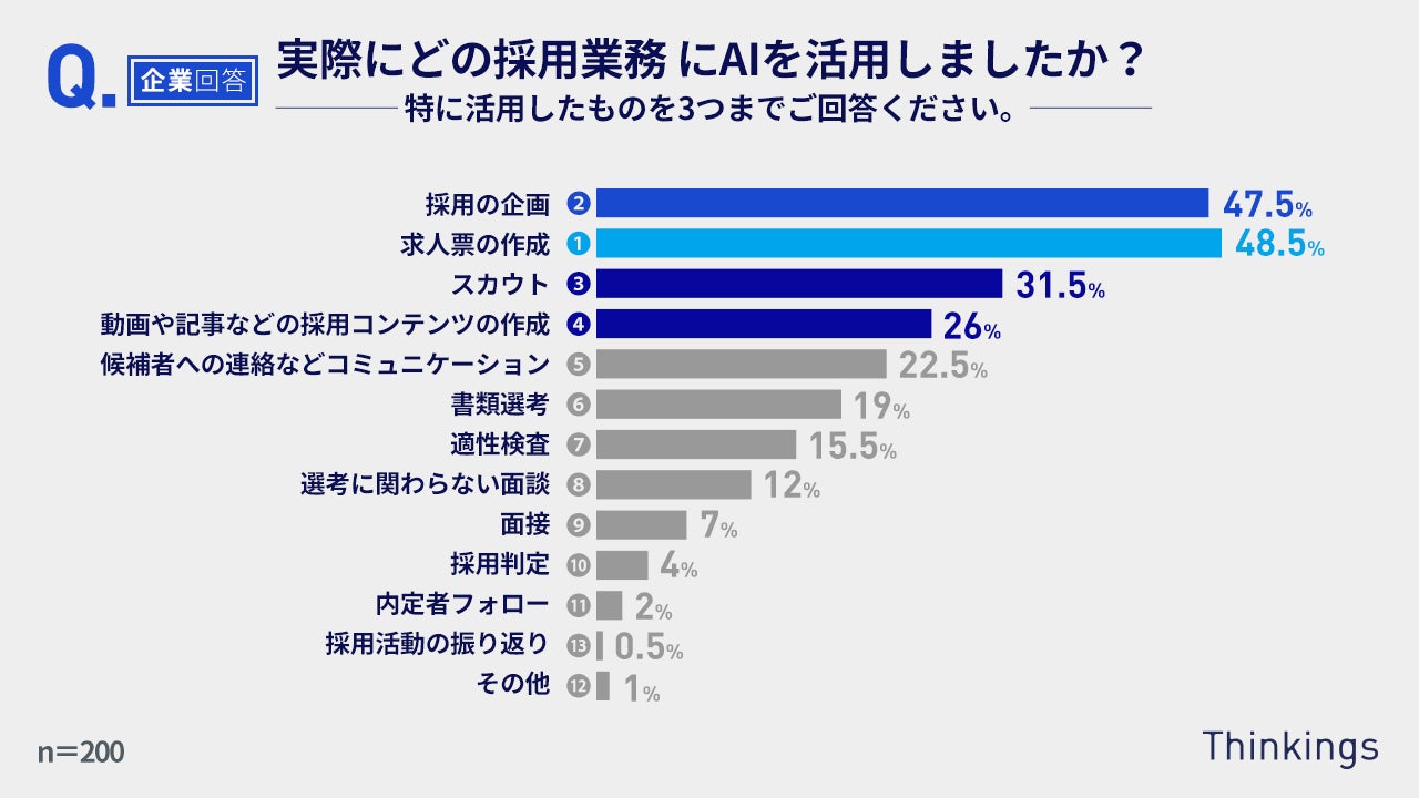 「求人票の作成」48.5%、「採用の企画」47.5%、「スカウト」31.5%、の順で多い結果に
