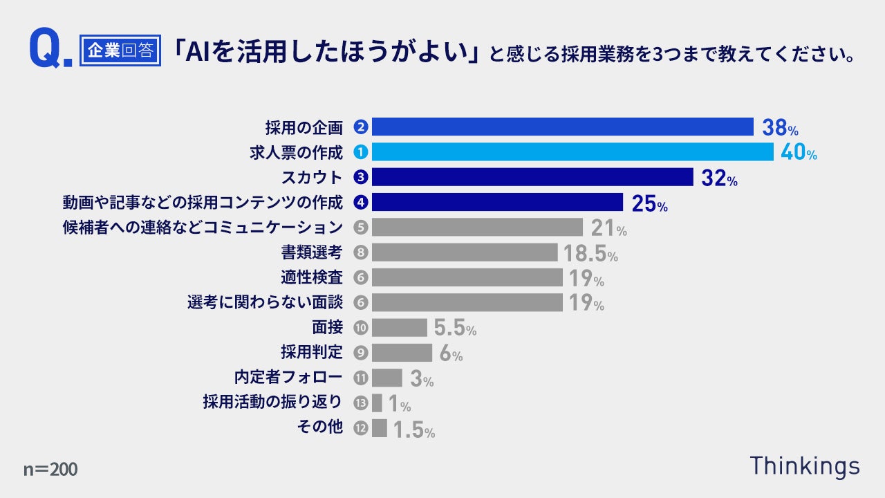 採用担当者に対して「特にAIを活用した採用業務」、および「AIを活用したほうがよいと感じる採用業務」を聞いたところ、いずれもトップ4まで同じ項目が並び、情報の作成やアイディア出しに関わる内容が選ばれました。一方で「人の手で対応したほうがよいと感じる採用業務」については、「スカウト」が27.5%とトップに。次いで「面接」など応募者と直接コミュニケーションを取ることが想定される場面が高い傾向が見えました。「スカウト」は、業務の性質として「母集団形成」と「魅力付け」の2つの側面を持つことから、前者の目的では「AI」・後者の目的では「人の手」、などの判断により両方の設問で上位に現れたと推測されます。