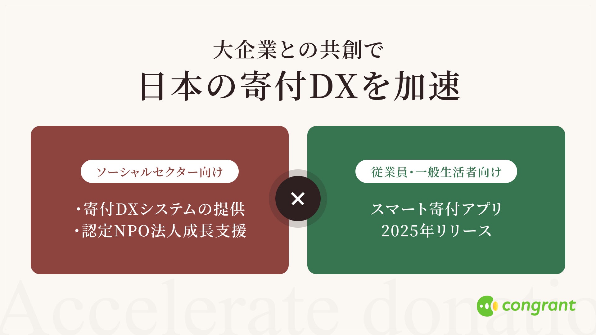 この「日本の寄付システムの課題」に対し、コングラントでは、寄付におけるあらゆる機能と体験価値を拡大していくこと、また、大企業との共創を積極的に展開していきます。
