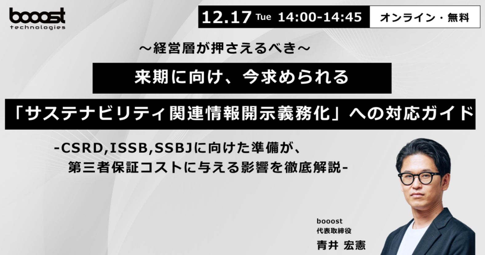 統合型SXプラットフォーム「サステナビリティERP(※1)」の提供により企業のサステナビリティ・トランスフォーメーション(SX)(※2)の加速を支援するbooost technologies株式会社(東京都品川区、代表取締役:青井宏憲 以下 当社)は、主に経営層を対象としたサステナビリティ関連情報開示義務化に対応するためのオンラインセミナー「~経営層が押さえるべき~ 来期に向け、今求められる「サステナビリティ関連情報開示義務化」への対応ガイド‐CSRD,ISSB,SSBJに向けた準備が、第三者保証コストに与える影響 を徹底解説」を12/17(火)14:00よりオンラインで開催します。