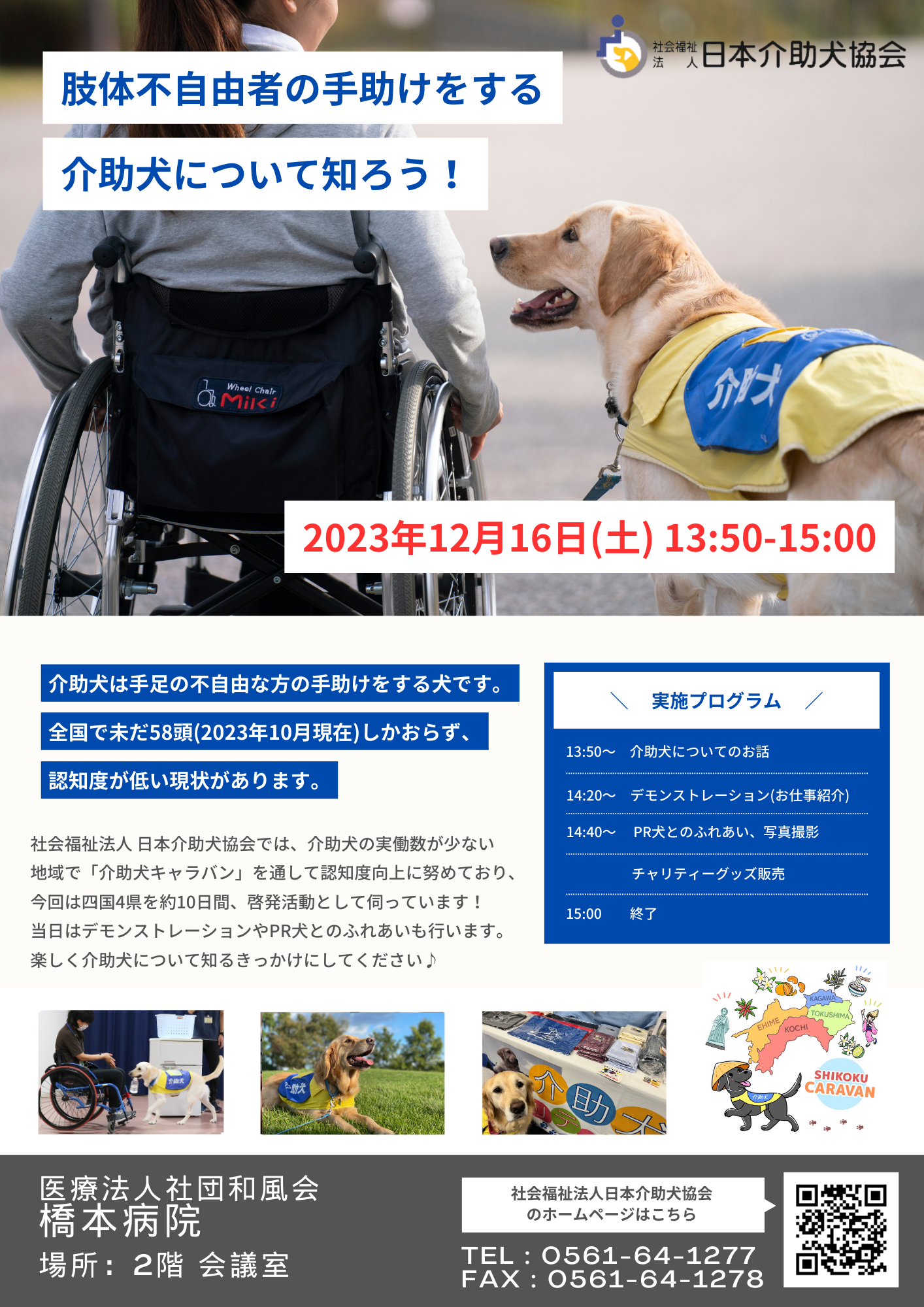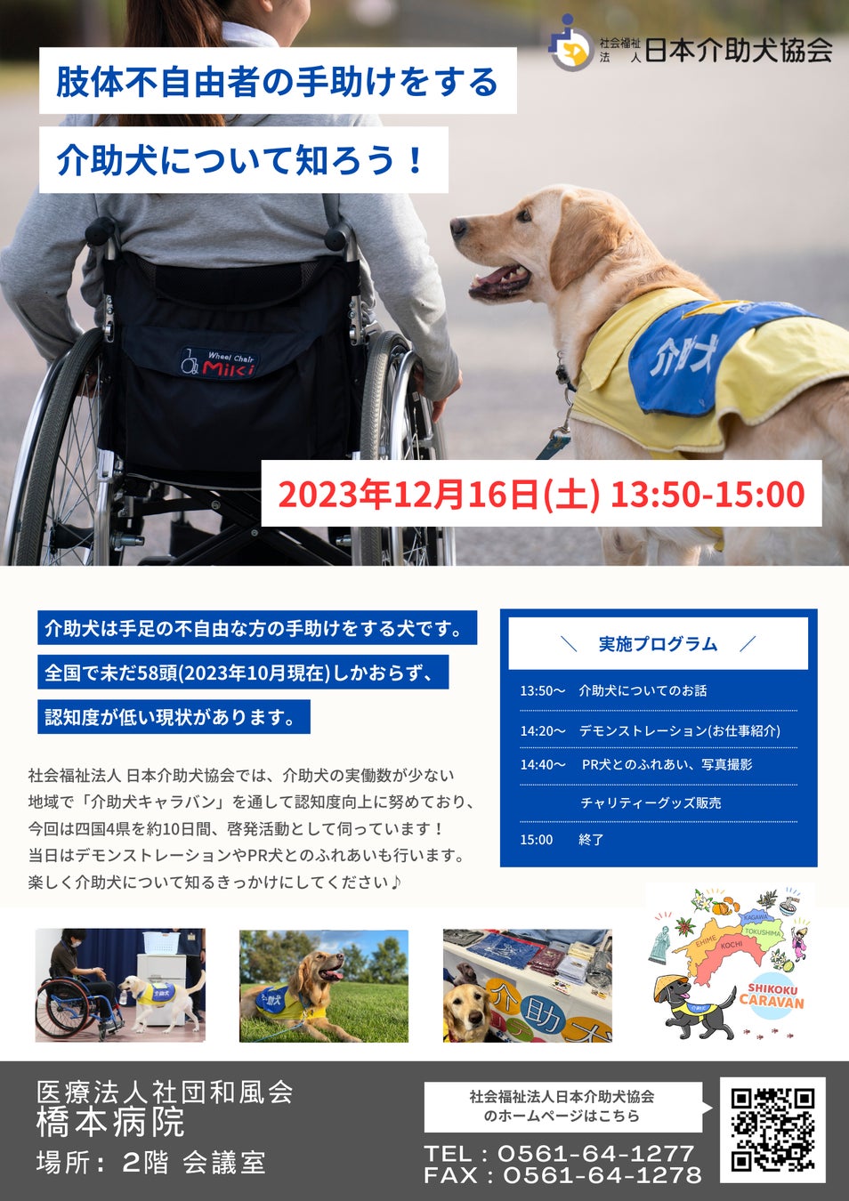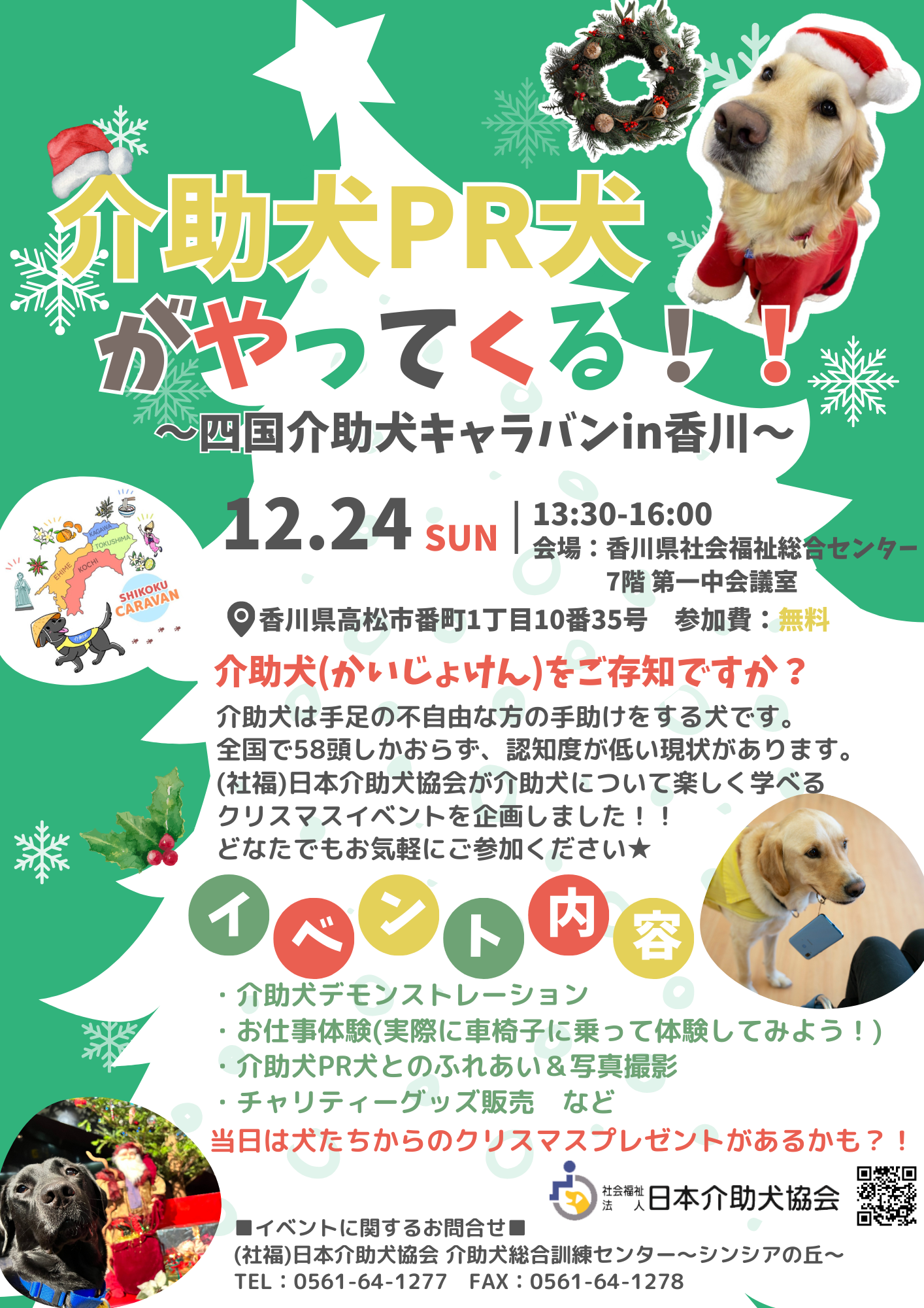 ●(福)日本介助犬協会が12月24日(日)~25日(月)に香川県に滞在し、四国地方にて介助犬の普及・啓発活動を行う「四国介助犬キャラバン」を実施する。