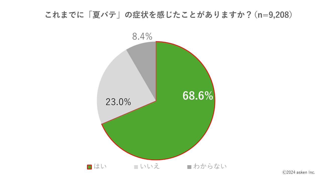 「これまでに『夏バテ』の症状を感じたことがありますか?」という質問に対して、68.6%が「はい」と回答しました。また、具体的な症状として「体がだるい」「疲れがとれない」「食欲不振」が上位に挙げられました。