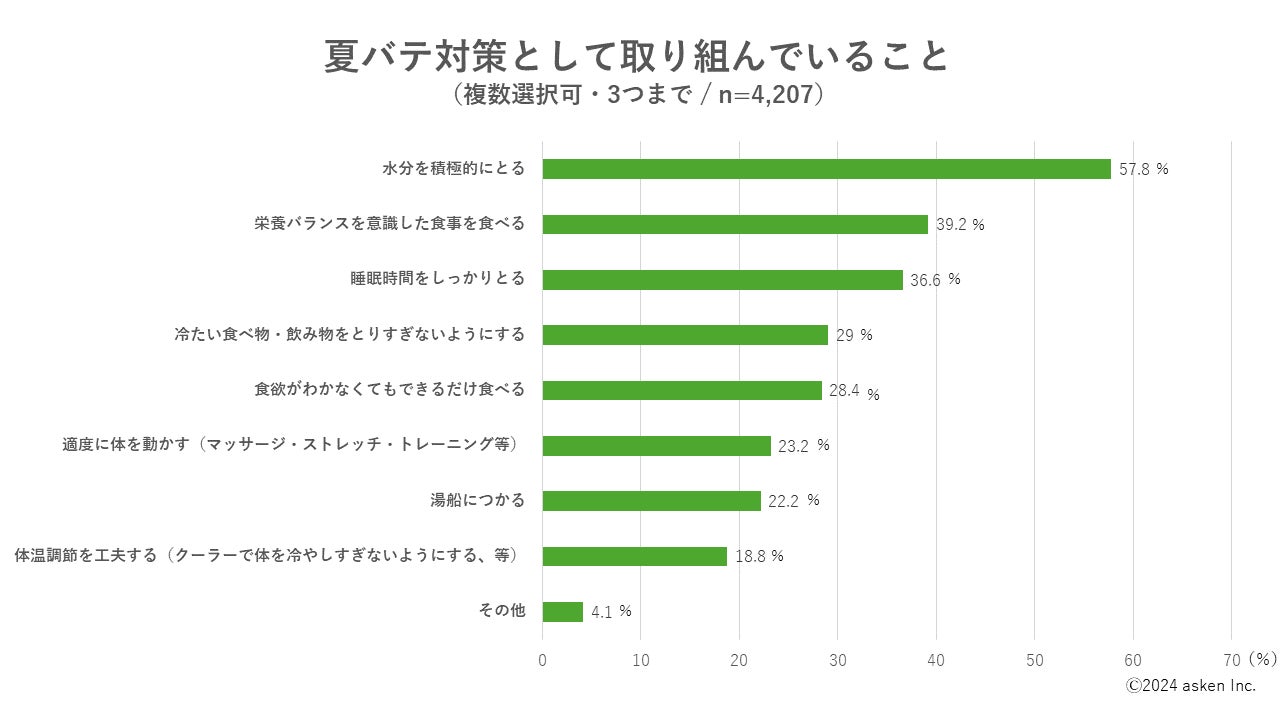 これまでに夏バテを感じたことがあると回答された方に、「夏バテ対策として行っていることがありますか?」と質問したところ、66.6%の方が「はい」と回答しました。具体的に夏バテ対策として取り組んでいることについては「水分を積極的にとる(57.8%)」のほか、「栄養バランスを意識した食事を食べる(39.2%)」「睡眠時間をしっかりとる(36.6%)」といった、食事や睡眠に関する内容が上位を占めました。