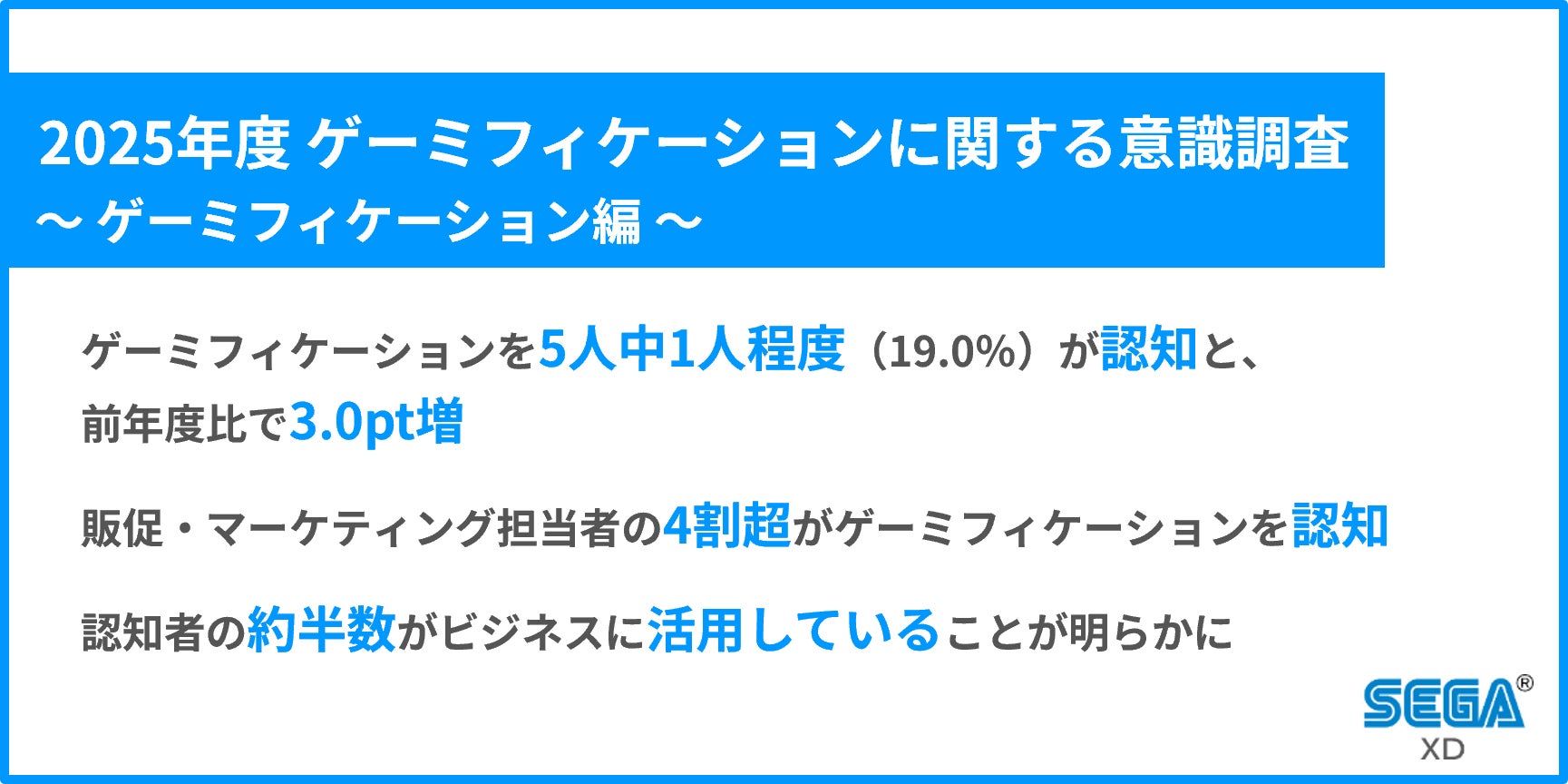 ゲーミフィケーション事業を展開する株式会社セガ エックスディー(本社:東京都新宿区、代表取締役 社長執行役員CEO:谷 英高、以下:セガXD)は、ビジネスパーソン(全国の20~50代男女)1,000人を対象に「2025年度 ゲーミフィケーションに関する意識調査」を実施しました。本リリースでは、「ゲーミフィケーション編」として、ゲーミフィケーションの認知・活用に関する結果を発表します。