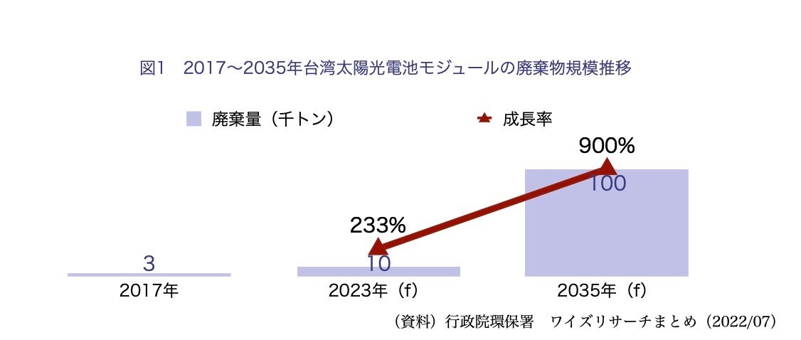 行政院環境保護署(環保署)の統計によると、2017年の太陽電池モジュールの廃棄量は約3000トンだった。経済部によると、太陽電池モジュールの設置容量は20年に6.5ギガワット(GW)に達し、25年に20ギガワットに上ると予想されている。太陽電池モジュールの製品寿命を20年として計算すると、太陽電池モジュールの23年の廃棄量は1万トンに上り、35年以降は毎年10万トンを超える太陽電池モジュールが廃棄される見通しだ。